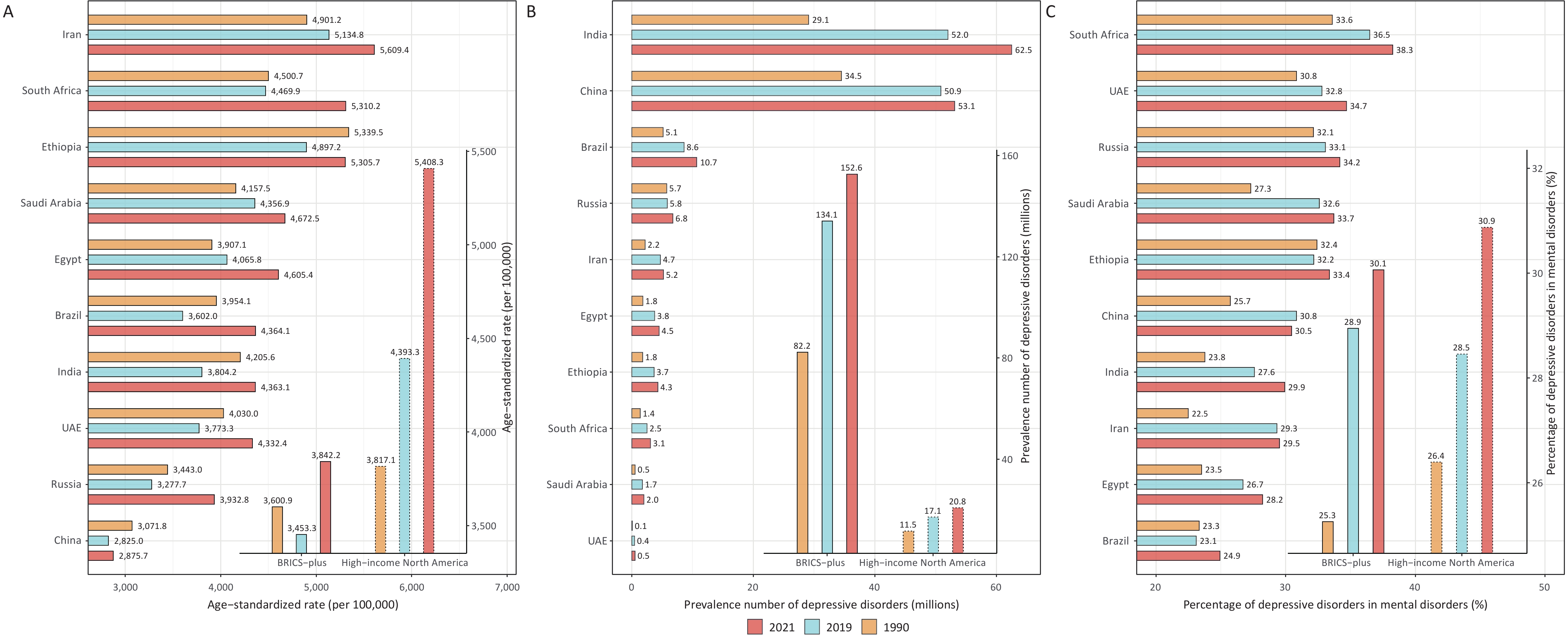 Figure 1. Age-standardized prevalence rates (A), total prevalence (B) of depressive disorders, and relative proportions of prevalences of all depressive disorders attributable to mental disorders (C) in BRICS Plus countries from 1992 to 2021. BRICS Plus = India, China, Brazil, Russia, Iran, Egypt, Ethiopia, South Africa, Saudi Arabia, and the UAE (United Arab Emirates); DALYs = disability-adjusted life years.