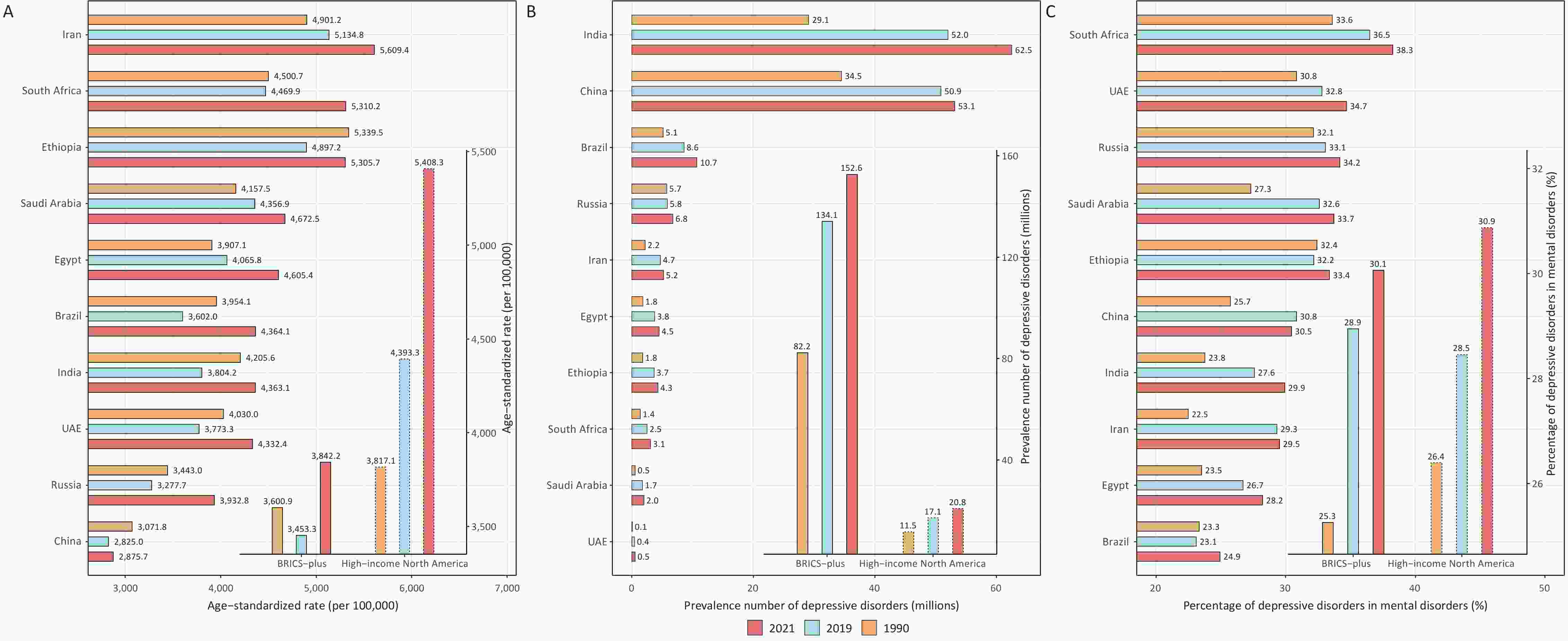 BRICS, which initially included Brazil, Russia, India, China, and South Africa due to their fast-growing economies, was later, in 2024, joined by Saudi Arabia, Iran, Egypt, the United Arab Emirates (UAE), and Ethiopia, expanding to 10 countries and finally forming BRICS Plus. At present, BRICS Plus economies account for nearly half of the world's population and bear approximately 40% of the global disease burden[4]. These countries have witnessed a consistent increase in the number of cases of depressive disorders from 1990 to 2019, which may be attributed to their rapid economic development and the heightened vulnerability of individuals facing adverse circumstances such as poverty, violence, and inequality[5,6]. The proportion of disability-adjusted life years (DALYs) attributable to depressive disorders relative to NCDs increased in BRICS Plus countries between 1990 and 2019, despite well-controlled infectious and cardiovascular diseases. At present, the systematic research across the BRICS Plus countries remains scarce, even in the context of research on the depressive disorder burden in numerous studies at the global, regional, and national levels[1,7-11]. For example, most existing studies have focused on the depressive disorder burden in single countries (e.g., China), with a glaring absence of cross-country comparative analyses[10,11]. Furthermore, these countries paid disproportionately little attention to mental health, despite their positive momentum in health cooperation[6]. The term "mental health" was introduced at the 2013 BRICS health ministers' meeting and was elevated to the leadership level in 2015[12]. However, BRICS Plus countries have largely neglected and unsatisfactory mental health management[10,12], accompanied by the substantial global psychological burden of COVID-19[13]. Unfortunately, the mental health impact of the COVID-19 pandemic was still less appreciated in BRICS Plus[14,15].