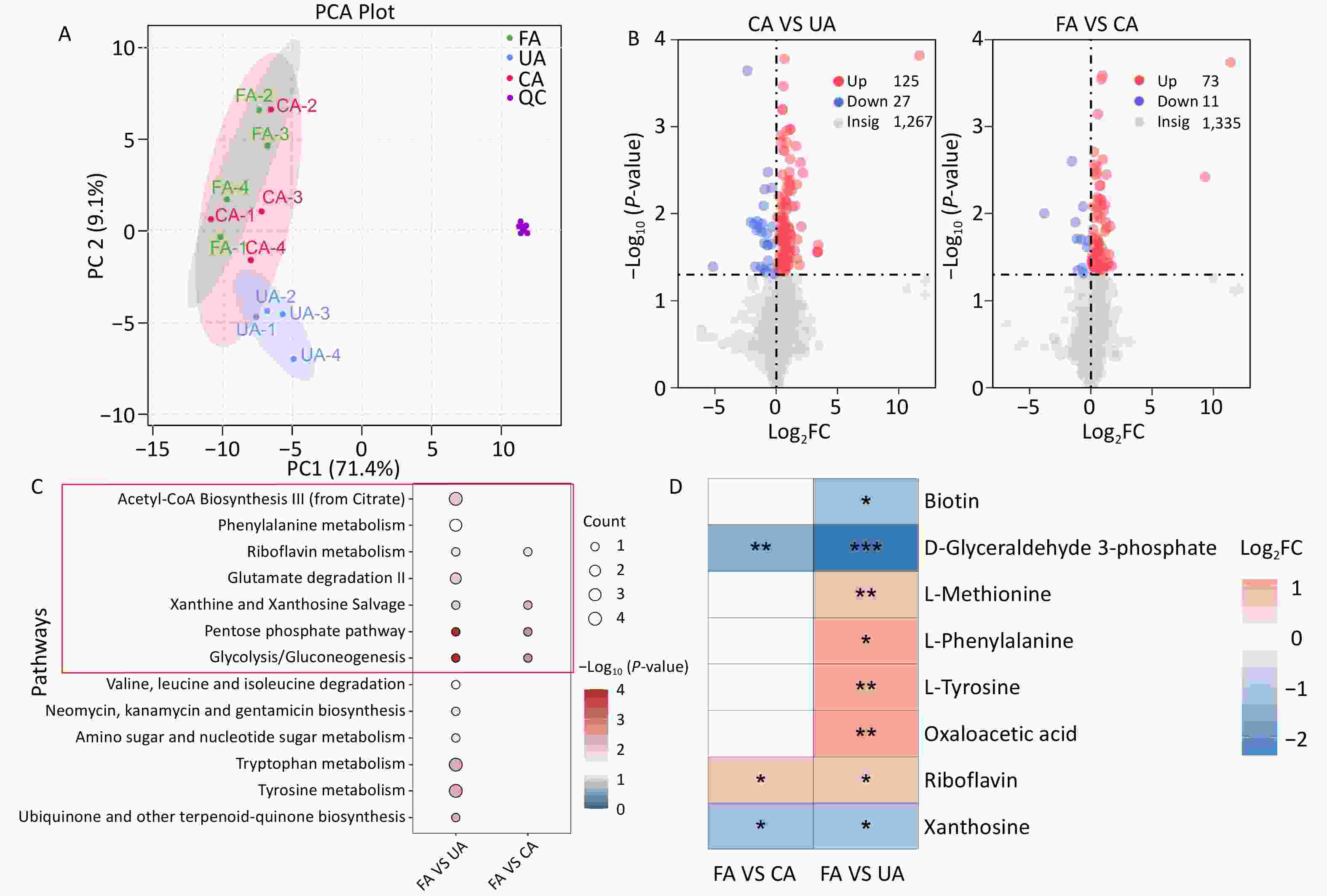 The experimental results are expressed as the means ± SD. Metabolomic data were processed using ProFinder software for raw LC-MS data extraction, and univariate and multivariate statistical analyses were conducted using Analyst 1.6.3 software. Differential metabolites were identified through univariate (t-tests, fold change) and multivariate [principal component analysis (PCA), orthogonal partial-least-squares discriminant analysis (OPLS-DA)] analyses using variable importance in projection (VIP) ≥ 1 and P < 0.05, followed by KEGG pathway enrichment. Detailed analytical methods are provided in the SI.