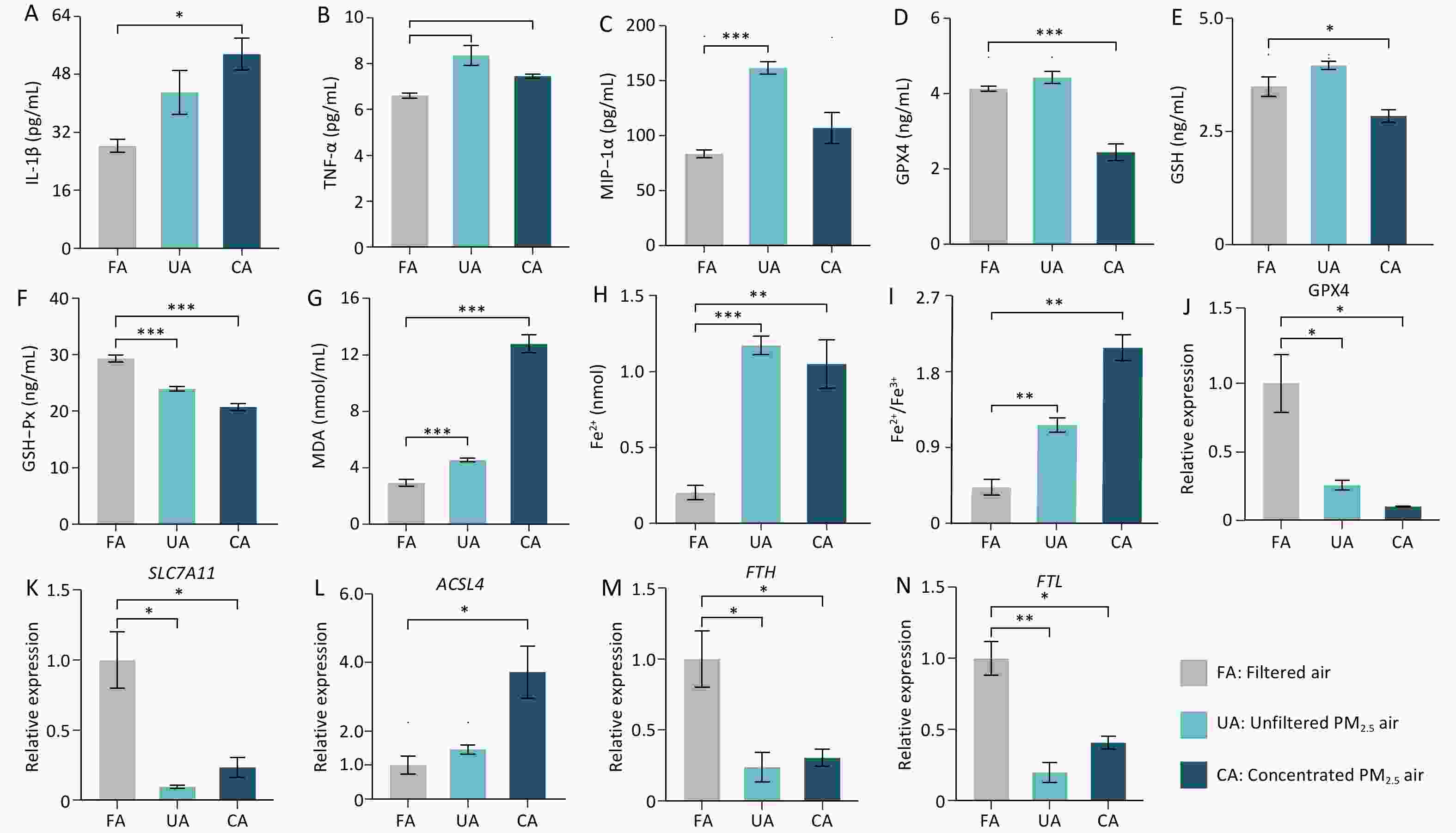 Both PM2.5-exposed groups showed elevated levels of TNF-α, MIP-1α, and MDA compared with controls, but with distinct cytokine profiles: IL-1β increased significantly only in the CA group, whereas MIP-1α increased significantly only in the UA group, indicating differential, dose-dependent inflammatory responses. In addition, the results also demonstrated significant ferroptosis induction by PM2.5, as evidenced by the decreased levels of GPX4, GSH, and GSH-Px, increased MDA, and increased Fe2+ concentrations and Fe2+/Fe3+ ratios in the lung tissues of both UA and CA groups compared with the controls; the Fe2+/Fe3+ ratio showed a clear dose-dependent increase. To further understand how PM2.5 triggers lung tissue damage in mice through ferroptosis, we examined changes in the expression levels of ferroptosis-related genes in mouse lung tissue following PM2.5 exposure. The results showed that, compared with those in the FA group, the expression levels of GPX4, SLC7A11, FTH, and FTL genes in mouse lung tissue were significantly downregulated in the UA and CA groups (Figures 4J-K, 4M-N). In contrast, ACSL4 expression was only significantly upregulated in the CA group (Figure 4L).
