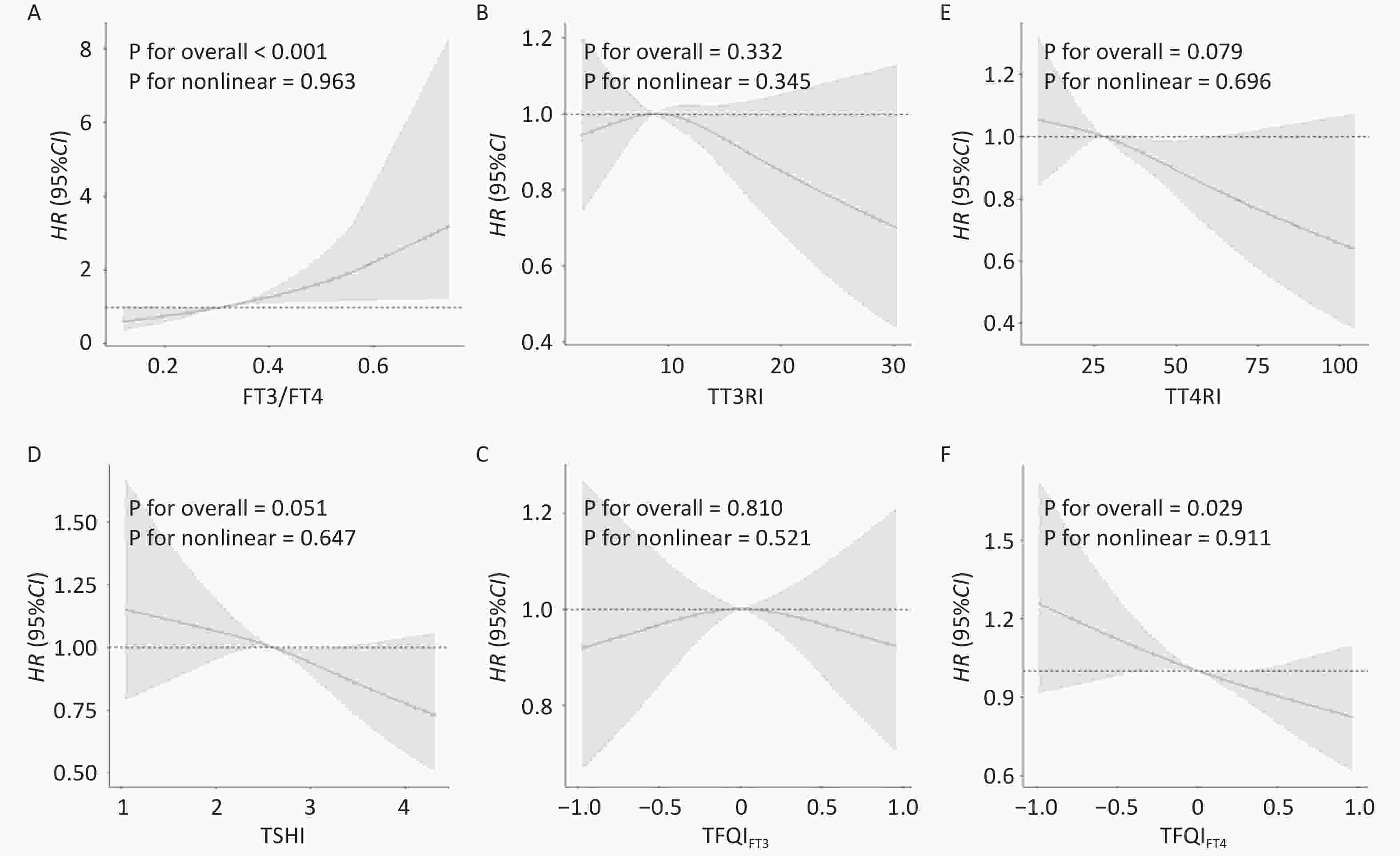 As shown in Figure 2, restricted cubic splines were used to flexibly model and visualize the relationships between FT3/FT4, TT3RI, TT4RI, TSHI, TFQIFT3, and TFQIFT4 with MAFLD. After adjusting for sex, age, BMI, WC, SBP, DBP, TG, TC, and LDL, the association between FT3/FT4 levels and MAFLD was statistically significant (P < 0.05). The restricted cubic spline model with knots located at 0.257, 0.314, and 0.388 did not suggest a nonlinear relationship (P > 0.05) (Figure 2A). No associations between TT3RI, TT4RI, TSHI, TFQIFT3 and MAFLD were found (P for overall > 0.05) (Figure 2B, 2C, 2D, and 2E). In Figure 2F, TFQIFT4 also showed a significant overall association (P for overall < 0.05). The restricted cubic spline model, with knots located at −0.570, 0.002, and 0.574, did not suggest a nonlinear relationship (P for nonlinear > 0.05).