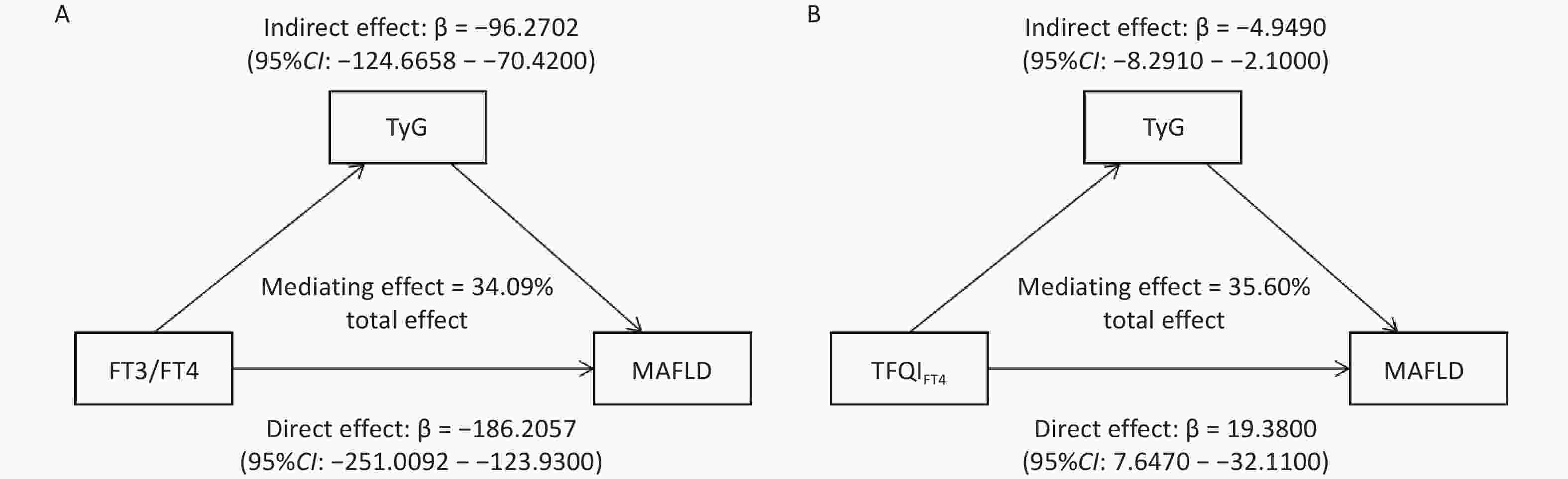 [1] Eslam M, Newsome PN, Sarin SK, et al. A new definition for metabolic dysfunction-associated fatty liver disease: an international expert consensus statement. J Hepatol, 2020; 73, 202−9. doi: 10.1016/j.jhep.2020.03.039 [2] Eslam M, Sanyal AJ, George J, et al. MAFLD: a consensus-driven proposed nomenclature for metabolic associated fatty liver disease. Gastroenterology, 2020; 158, 1999-2014. e1. [3] Pais R, Fartoux L, Goumard C, et al. Temporal trends, clinical patterns and outcomes of NAFLD-related HCC in patients undergoing liver resection over a 20-year period. Aliment Pharmacol Ther, 2017; 46, 856−63. doi: 10.1111/apt.14261 [4] Ledford H. First US drug approved for a liver disease surging around the world. Nature, 2024. [5] Liu JY, Ayada I, Zhang XF, et al. Estimating global prevalence of metabolic dysfunction-associated fatty liver disease in overweight or obese adults. Clin Gastroenterol Hepatol, 2022; 20, e573−82. doi: 10.1016/j.cgh.2021.02.030 [6] Qiu L, Wang DC, Xu T, et al. Influence of gender, age and season on thyroid hormone reference interval. Natl Med J China, 2018; 98, 1582−7. (In Chinese) [7] Shan XY, Zou Y, Huang LC, et al. Iodine nutrition, thyroid-stimulating hormone, and related factors of postpartum women from three different areas in China: a cross-sectional survey. Biomed Environ Sci, 2024; 37, 254−65. [8] Li XZ, Wu CL, Cen LT, et al. Association of thyroid nodules with various elements in urine and blood serum: a case-control study. Biomed Environ Sci, 2024; 37, 320−4. [9] Wang LJ, Wu JN, Wu XY, et al. Thyroid nodule prevalence and iodine nutrition: influencing factors in coastal areas. Biomed Environ Sci, 2024; 37, 1221−6. [10] Sinha RA, Singh BK, Yen PM. Direct effects of thyroid hormones on hepatic lipid metabolism. Nat Rev Endocrinol, 2018; 14, 259−69. doi: 10.1038/nrendo.2018.10 [11] Ludwig U, Holzner D, Denzer C, et al. Subclinical and clinical hypothyroidism and non-alcoholic fatty liver disease: a cross-sectional study of a random population sample aged 18 to 65 years. BMC Endocr Disord, 2015; 15, 41. doi: 10.1186/s12902-015-0030-5 [12] Laclaustra M, Moreno-Franco B, Lou-Bonafonte JM, et al. Impaired sensitivity to thyroid hormones is associated with diabetes and metabolic syndrome. Diabetes Care, 2019; 42, 303−10. doi: 10.2337/dc18-1410 [13] Yang SJ, Lai SQ, Wang ZX, et al. Thyroid feedback quantile-based index correlates strongly to renal function in euthyroid individuals. Ann Med, 2021; 53, 1945−55. doi: 10.1080/07853890.2021.1993324 [14] Yagi H, Pohlenz J, Hayashi Y, et al. Resistance to thyroid hormone caused by two mutant thyroid hormone receptors beta, R243Q and R243W, with marked impairment of function that cannot be explained by altered in vitro 3, 5, 3’-triiodothyroinine binding affinity. J Clin Endocrinol Metab, 1997; 82, 1608−14. [15] Jostel A, Ryder WDJ, Shalet SM. The use of thyroid function tests in the diagnosis of hypopituitarism: definition and evaluation of the TSH Index. Clin Endocrinol, 2009; 71, 529−34. doi: 10.1111/j.1365-2265.2009.03534.x [16] Zhang SJ, Du TT, Zhang JH, et al. The triglyceride and glucose index (TyG) is an effective biomarker to identify nonalcoholic fatty liver disease. Lipids Health Dis, 2017; 16, 15. doi: 10.1186/s12944-017-0409-6 [17] Li YZ, Teng D, Shi XG, et al. Prevalence of diabetes recorded in mainland China using 2018 diagnostic criteria from the American Diabetes Association: national cross sectional study. BMJ, 2020; 369, m997. [18] Miao L, Targher G, Byrne CD, et al. Current status and future trends of the global burden of MASLD. Trends Endocrinol Metab, 2024; 35, 697−707. doi: 10.1016/j.tem.2024.02.007 [19] Han XY, Guo B, Wang LL, et al. The mediation role of blood lipids on the path from air pollution exposure to MAFLD: a longitudinal cohort study. Sci Total Environ, 2023; 904, 166347. doi: 10.1016/j.scitotenv.2023.166347 [20] Xu CF, Xu L, Yu CH, et al. Association between thyroid function and nonalcoholic fatty liver disease in euthyroid elderly Chinese. Clin Endocrinol, 2011; 75, 240−6. doi: 10.1111/j.1365-2265.2011.04016.x [21] Gu YQ, Wu XH, Zhang Q, et al. High-normal thyroid function predicts incident nonalcoholic fatty liver disease among middle-aged and older euthyroid subjects. J Gerontol A Biol Sci Med Sci, 2022; 77, 197−203. doi: 10.1093/gerona/glab037 [22] Wan H, Yu GF, Xu SR, et al. Central sensitivity to free triiodothyronine with MAFLD and its progression to liver fibrosis in euthyroid adults. J Clin Endocrinol Metab, 2023; 108, e687−97. doi: 10.1210/clinem/dgad186 [23] Sun HL, Zhu W, Liu J, et al. Reduced sensitivity to thyroid hormones is associated with high remnant cholesterol levels in Chinese euthyroid adults. J Clin Endocrinol Metab, 2022; 108, 166−74. doi: 10.1210/clinem/dgac523 [24] Lang XY, Zhao B, Fang SH, et al. Higher peripheral thyroid sensitivity is linked to a lower risk of heart failure after acute myocardial infarction. J Clin Endocrinol Metab, 2023; 108, 2950−60. doi: 10.1210/clinem/dgad240 [25] Lai SQ, Li JR, Wang ZX, et al. Sensitivity to thyroid hormone indices are closely associated with NAFLD. Front Endocrinol, 2021; 12, 766419. doi: 10.3389/fendo.2021.766419 [26] Li RF, Zhou L, Chen C, et al. Sensitivity to thyroid hormones is associated with advanced fibrosis in euthyroid patients with non-alcoholic fatty liver disease: a cross-sectional study. Dig Liver Dis, 2023; 55, 254−61. doi: 10.1016/j.dld.2022.06.021 [27] Bektur Aykanat NE, Şahin E, Kaçar S, et al. Investigation of the effect of hyperthyroidism on endoplasmic reticulum stress and tran- sient receptor potential canonical 1 channel in the kidney. Turk J Med Sci, 2021; 51, 1554−63. [28] Lim S, Kim JW, Targher G. Links between metabolic syndrome and metabolic dysfunction-associated fatty liver disease. Trends Endocrinol Metab, 2021; 32, 500−14. doi: 10.1016/j.tem.2021.04.008 [29] Taylor PN, Razvi S, Pearce SH, et al. A review of the clinical consequences of var