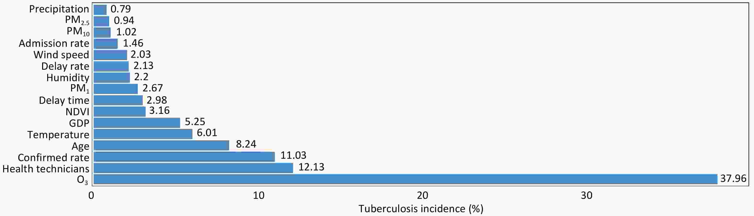 Factors Variables Time (%) Space (%) Remaining (%) Relative Importance (%) Socioeconomic GDP 2.56 0.45 2.23 5.24 Health Technicians 3.95 2.54 5.64 12.13 Total 6.52 3.00 7.85 17.37 Meteorological Wind Speed 0.61 0.80 0.62 2.03 Precipitation 0.23 0.27 0.29 0.79 Temperature 1.40 2.55 2.06 6.01 Humidity 0.77 0.79 0.64 2.20 Total 3.00 4.42 3.61 11.03 Air Pollution PM1 0.43 0.31 0.28 1.02 PM2.5 0.37 0.27 0.30 0.94 PM10 1.07 0.71 0.89 2.67 O3 15.49 10.26 12.21 37.96 Total 17.36 11.56 13.68 42.60 Geographical NDVI 0.71 1.52 0.93 3.16 Note. Clinical factors (age: 8.24%, delay time: 2.98%, delay rate: 2.13%, confirmed rate: 11.03%, admission rate: 1.46%) contribute a total of 25.84%. This study has some limitations. First, owing to data limitations, certain unmeasured factors, such as occupational categories, population migration, and host-related susceptibility, were excluded from the analysis of TB incidence. Second, the coarse spatial resolution of the ecological data at the county/district level, together with the use of annual data on TB incidence and associated factors, may have led to exposure misclassification and an ecological fallacy. Therefore, our results may not be directly applicable to individual-level conclusions. Finally, using reported cases as proxies for actual prevalence may introduce bias, as potential underreporting and reporting inconsistencies may undermine the reliability of the results.
