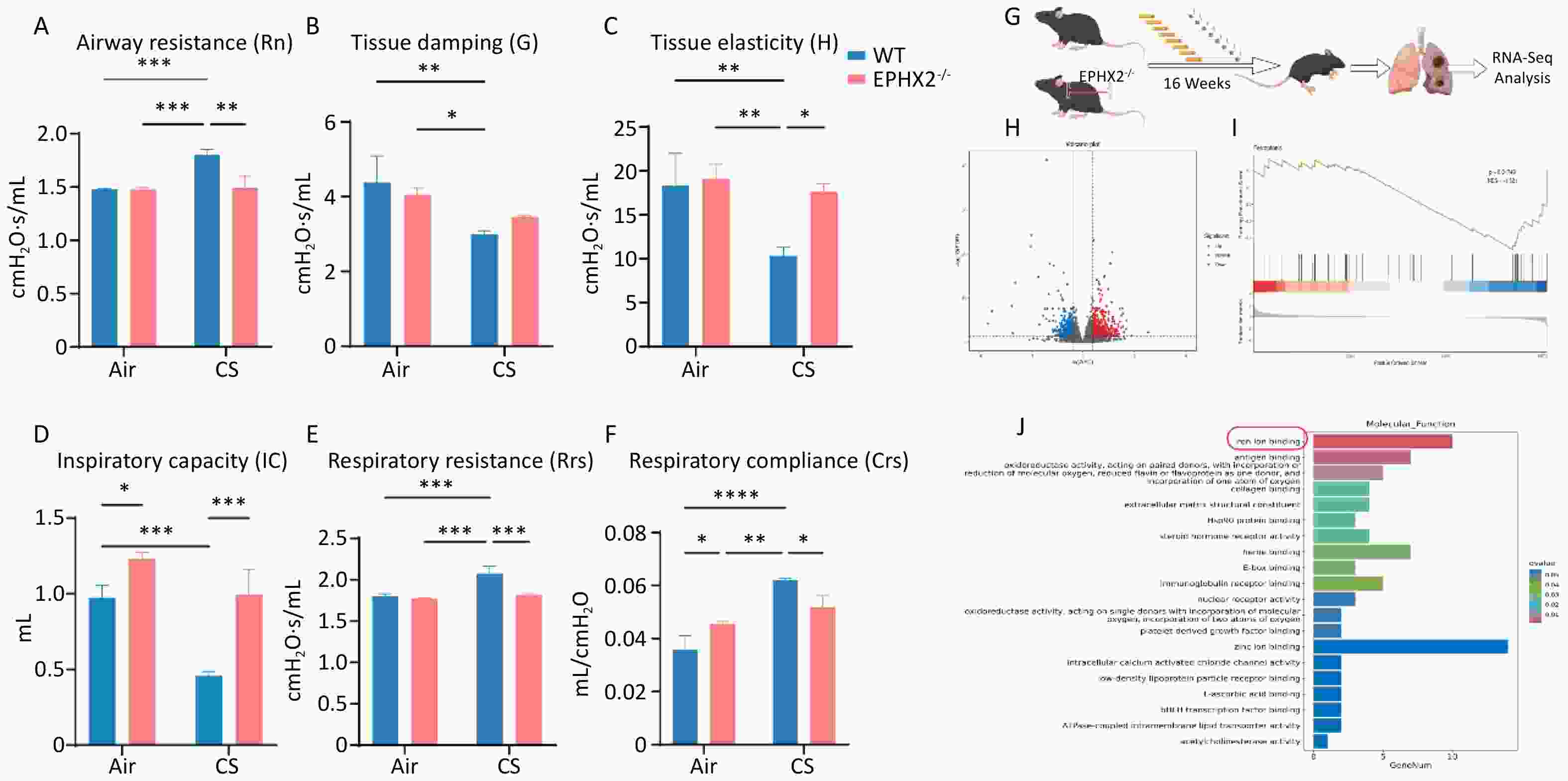 A–F. Ephx2-/- mice following CS exposure exhibited less impairment of lung function. Rn, Rrs, IC, and tissue damage were determined in WT and Ephx2-/- mice exposed to air and CS. After 16 weeks of exposure to CS, Rrs and Rn were significantly increased, whereas the IC and tissue damage were significantly reduced compared with exposure to air. The Rrs and Rn were significantly lower in Ephx2-/- + CS mice than in WT + CS mice. In addition, the IC and tissue damage in Ephx2-/- + CS mice were higher than that in WT + CS mice. Data are expressed as mean ± SD (n = 6 mice per group). *P < 0.05, **P < 0.01, ***P < 0.001, ****P < 0.0001. G–J. RNA-seq analysis was conducted in both WT + CS mice and Ephx2-/- + CS mice. A total of 753 DEGs were identified, with 474 upregulated (indicated by red dots) and 279 downregulated (indicated by blue dots) genes. KEGG pathway analysis revealed that the ferroptosis signaling pathway was significantly modulated in Ephx2-/- + CS mice, and GSEA further validated it. CS, cigarette smoke; Ephx2-/-, Ephx2 deficiency; SD, standard deviation; WT, wild-type; RNA-seq, RNA-sequencing; DEG, differentially expressed genes; KEGG, Kyoto Encyclopedia of Genes and Genomes; GSEA, gene set enrichment analysis.