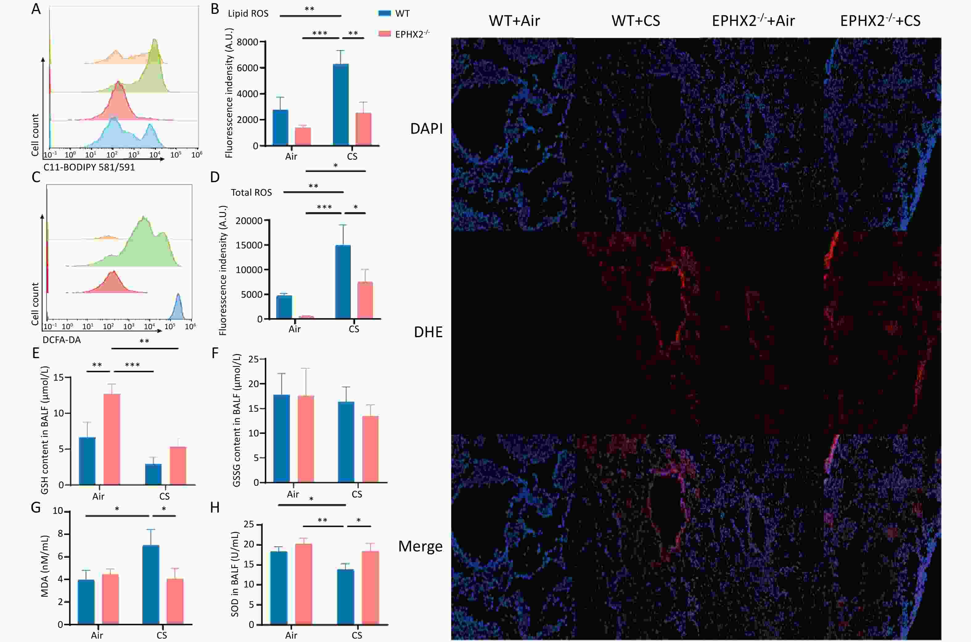 A&B. After 16 weeks of CS exposure, the levels of lipid ROS in the BALF of each group of mice were determined using flow cytometric analysis. Orange color represents air-exposed WT mice, red color represents air-exposed Ephx2-/- mice, green color represents WT + CS mice, and blue color represents Ephx2-/- + CS mice. The levels of lipid ROS in CS-exposed mice were significantly higher than those in air-exposed mice. Compared with WT + CS mice, Ephx2-/- + CS mice exhibited significantly lower levels of lipid ROS. C&D. Total ROS levels in the BALF of mice were detected by flow cytometry using a DCFH-DA probe. Total ROS levels in CS-exposed mice were significantly higher than those in air-exposed mice. Compared with WT + CS mice, Ephx2-/- + CS mice showed significantly lower levels of total ROS. E–H. After 16 weeks of CS exposure, BALF from each group of mice was collected for analysis. The levels of GSH and SOD in the BALF of mice exposed to CS were significantly lower than those in air-exposed mice. Moreover, MDA levels in the BALF of WT mice exposed to CS were significantly higher than those in air-exposed mice. Compared with WT + CS mice, SOD levels in the BALF of Ephx2-/- + CS mice were significantly higher, whereas those of MDA in Ephx2-/- + CS mice were significantly lower. GSH levels in the BALF of Ephx2-/- + CS mice were higher, while GSSG levels in the BALF of Ephx2-/-+CS mice were lower than those in WT + CS mice. Data are expressed as mean ± SD (n = 6 mice per group), *P < 0.05, **P < 0.01, ***P < 0.001. I. DCFH-DA probe was used to determine the total ROS levels in the lung tissue. ROS levels were significantly increased in the airways of WT + CS mice. Compared with WT + CS mice, ROS levels were lower in the airways of Ephx2-/- + CS mice. BALF, bronchoalveolar lavage fluid; CS, cigarette smoke; DCFH-DA, 2′,7′-dichlorodihydrofluorescein diacetate; GSH, glutathione; GSSG, oxidized glutathione; Ephx2-/-, Ephx2 deficiency; MDA, malondialdehyde; ROS, reactive oxygen species; SD, standard deviation; SOD, superoxide dismutase; WT, wild-type