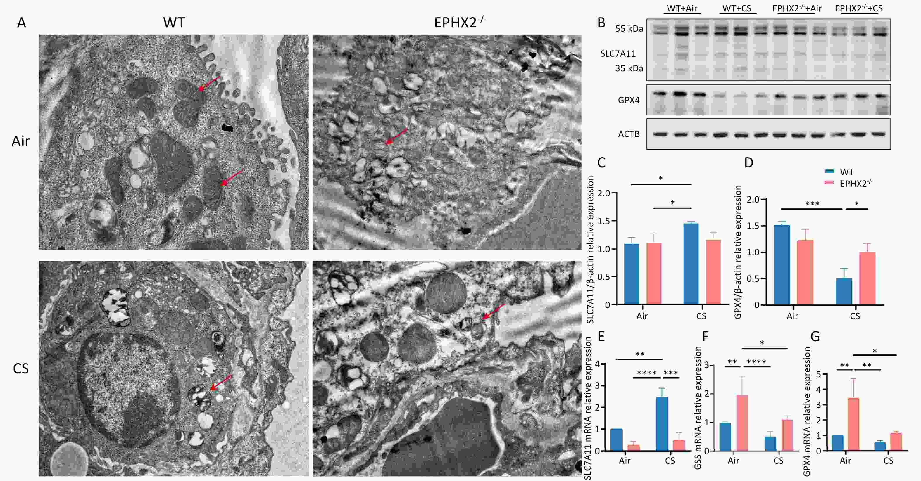 A. The mitochondrial morphology of in bronchial epithelial cells was altered in CS-exposed mice compared with air-exposed mice, mainly manifested as thickening of the mitochondrial membrane. This change was observed in both CS-exposed groups but was more pronounced in the WT group. The red arrow indicates mitochondria. B–D. Western blot assay results showed that SLC7A11 levels were higher and GPX4 levels were lower in CS-exposed mice than in air-exposed mice. After exposure to CS, Ephx2-/- mice exhibited lower levels of SLC7A11 and significantly higher levels of GPX4 than those of WT mice. Data are expressed as mean ± SD (n = 6 mice per group), *P < 0.05, ***P < 0.001. E–G. RT-qPCR assay showed that SLC7A11 levels were significantly higher and GSS and GPX4 levels were lower in CS-exposed mice than in air-exposed mice. After exposure to CS, Ephx2-/- mice exhibited significantly lower levels of SLC7A11 and higher levels of GSS and GPX4 than those of WT mice. Data are represented as mean ± SD (n = 6 mice per group), *P < 0.05, **P < 0.01, ***P < 0.001, ****P < 0.0001. CS, cigarette smoke; GPX4, glutathione/glutathione peroxidase 4; GSH, glutathione; SLC7A11, solute carrier family 7 member 11; GSS, glutamine synthetase; WT, wild-type; Xc-, system cystine