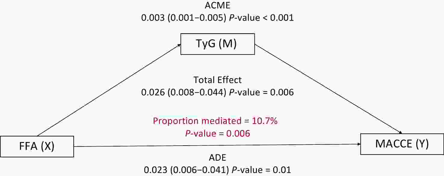 To assess the potential nonlinear relationships between FFA, TyG index, and MACCE, we fitted a restricted cubic spline (RCS) model with four knots placed at the 5th, 35th, 65th, and 95th percentiles of its distribution. Additionally, a causal mediation analysis based on the Cox proportional hazards regression model was conducted to explore whether insulin resistance mediates the relationship between FFA and cardiovascular events. In this analysis, FFA (continuous) was treated as the exposure, TyG (continuous) as the mediator, and MACCE as the outcome variable.
