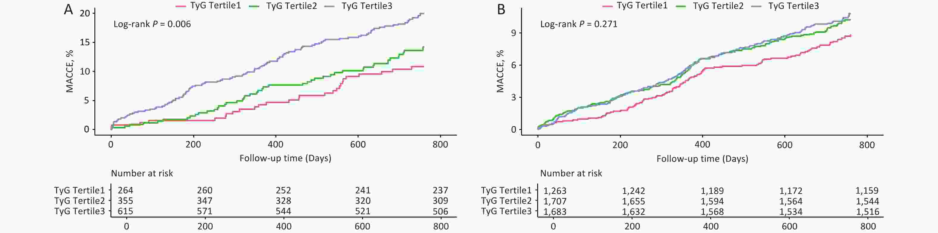 Stratified analysis is shown in Table 5, where the risk of MACCE increased with higher TyG tertiles in patients with elevated FFA levels but not in those with normal FFA levels (P for trend = 0.001). The Kaplan–Meier survival curves further supported this conclusion (Log-rank P = 0.006 vs. Log-rank P = 0.271; Figure 5).