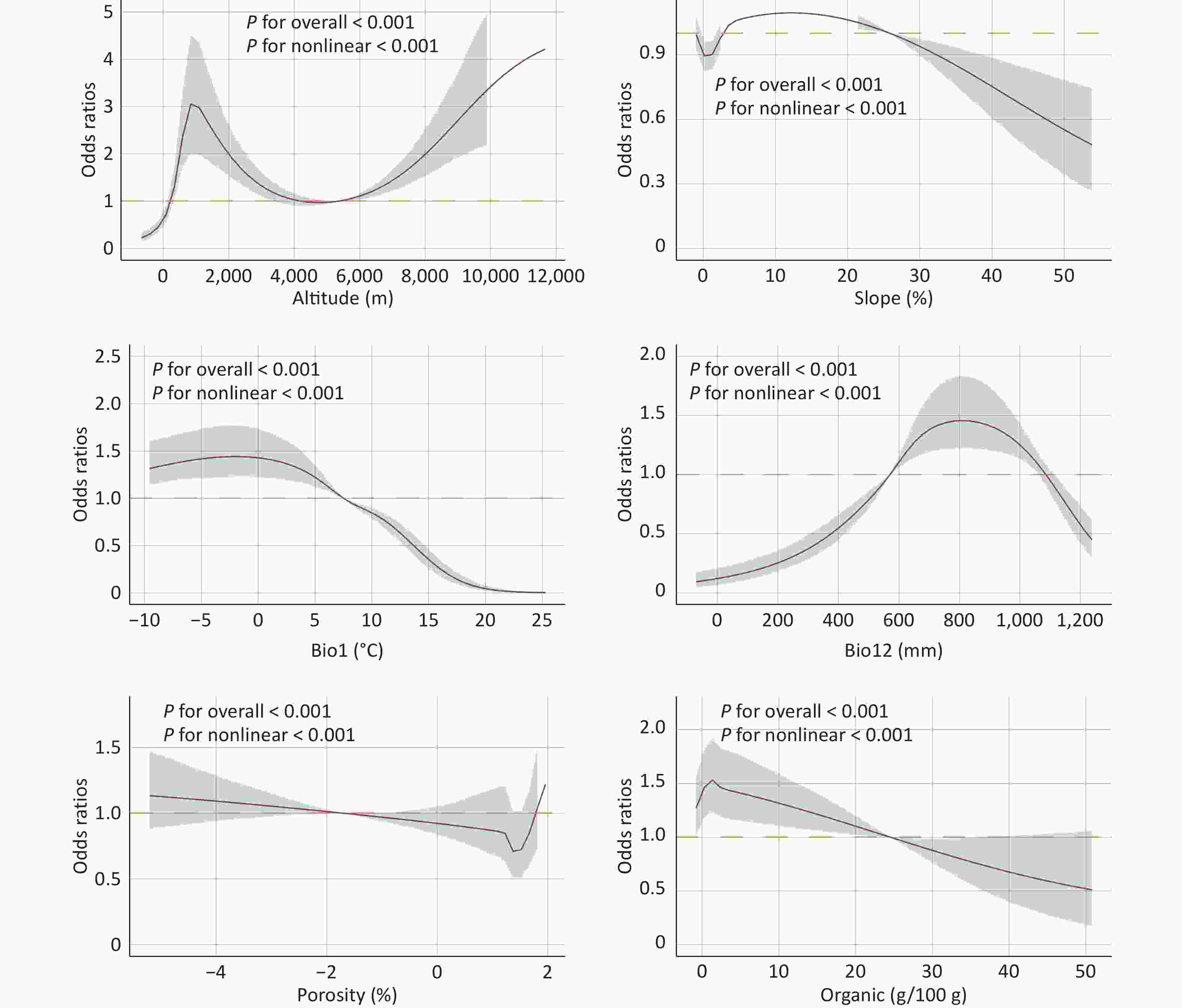 Figure 2. Nonlinear dose-response relationships of environmental factors with the risk of being classified as KBD-endemic areas (RCS analysis). Note: The red solid line represents the estimated ORs of KBD severity across the range of each environmental variable, and the blue shaded area indicates the 95% CrI. The P for overall assesses the overall significance of the variable, while the P for nonlinear evaluates the degree of deviation from linearity. Abbreviations: OR, odds ratio; CrI, credible interval; Bio1, annual mean temperature; Bio12, annual precipitation.