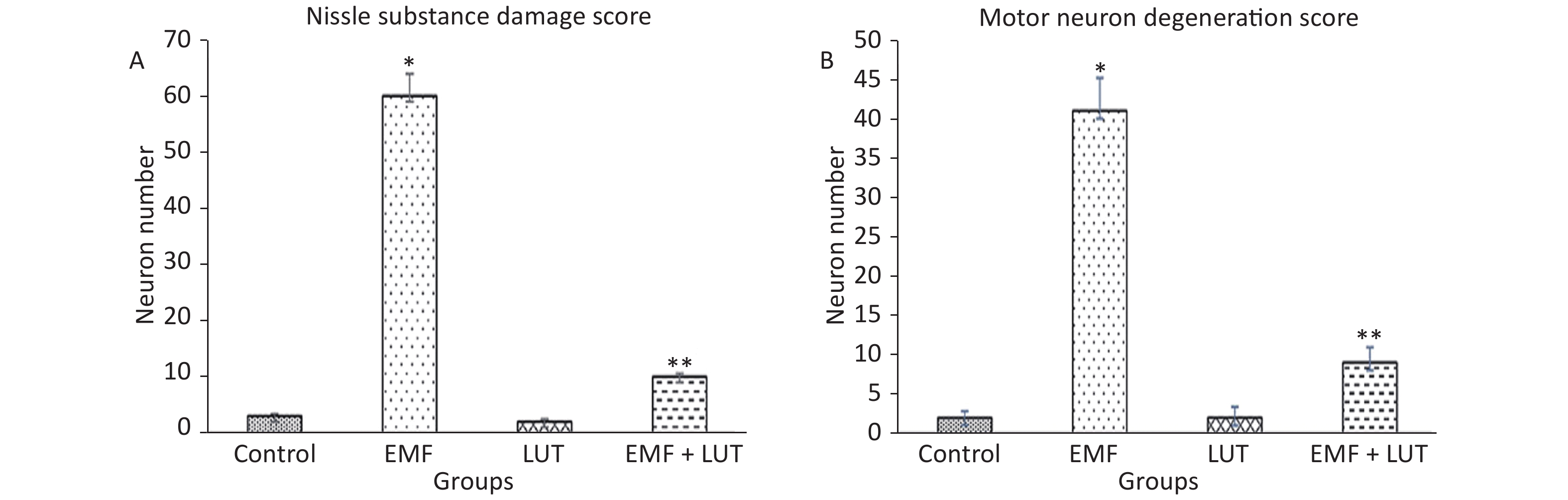 Objective This study aimed to investigate the effect of exposure to a 900 MHz electromagnetic field (EMF) on the cervical spinal cord (CSC) of rats and the possible protective effect of luteolin (LUT) against CSC tissue damage.Methods Quantitative data were obtained via stereological, biochemical, immunohistochemical, and histopathological techniques. We investigated morphometric value, superoxide dismutase (SOD) level, and the expression of high-mobility group box 1 protein molecules, as well as histological changes.Results The total number of motor neurons in the EMF group significantly decreased in comparison with that in the control group (P < 0.05). In the EMF + LUT group, we found a significant increase in the total number of motor neurons compared with that in the EMF group (P < 0.05). SOD enzyme activity in the EMF group significantly increased in comparison with that in the control group (P < 0.05). By contrast, the EMF+LUT group exhibited a decrease in SOD level compared with the EMF group (P < 0.05).Conclusion Our results suggested that exposure to EMF could be deleterious to CSC tissues. Furthermore, the protective efficacy of LUT against SC damage might have resulted from the alleviation of oxidative stress caused by EMF.