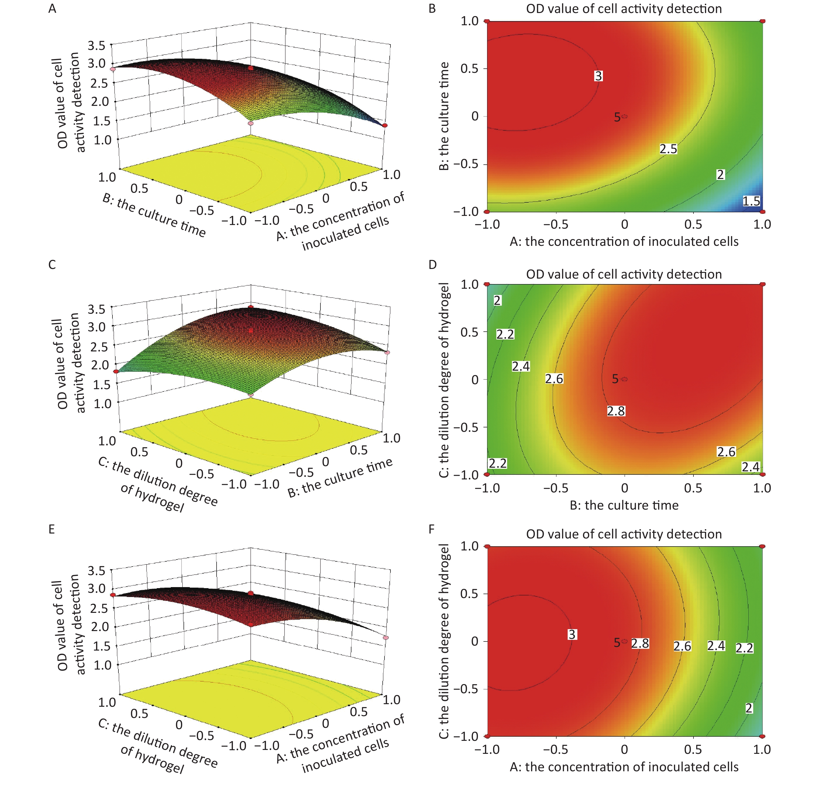 Objective This study optimizes three-dimensional (3D) culture conditions of HepG2 using response surface methodology (RSM) based on the VitroGel system to facilitate the cell model in vitro for liver tissues. Method HepG2 cell was 3D cultured on the VitroGel system. Cell viability was detected using Cell Counting Kit-8 (CCK-8) assay of HepG2 lived cell numbers. The proliferation of HepG2 cell and clustering performance was measured via fluorescence staining test. Albumin concentration in the culture medium supernatant as an index of HepG2 cell biological function was measured with ELISA kit. Independent factor tests were conducted with three key factors: inoculated cell concentration, cultured time, and dilution degree of the hydrogel. The preliminary results of independent factor tests were used to determine the levels of factors for RSM. Result The selected optimal culture conditions are as follows: concentration of inoculated cells was 4.44 × 105/mL, culture time was 4.86 days, and hydrogel dilution degree was 1:2.23. The result shows that under optimal conditions, the predicted optical density (OD) value of cell viability was 3.10 and measured 2.978 with a relative error of 3.94%. Conclusion This study serves as a reference for the 3D HepG2 culture and constructs liver tissues in vitro. Additionally, it provides the foundation for repeated dose high-throughput toxicity studies and other scientific research work.