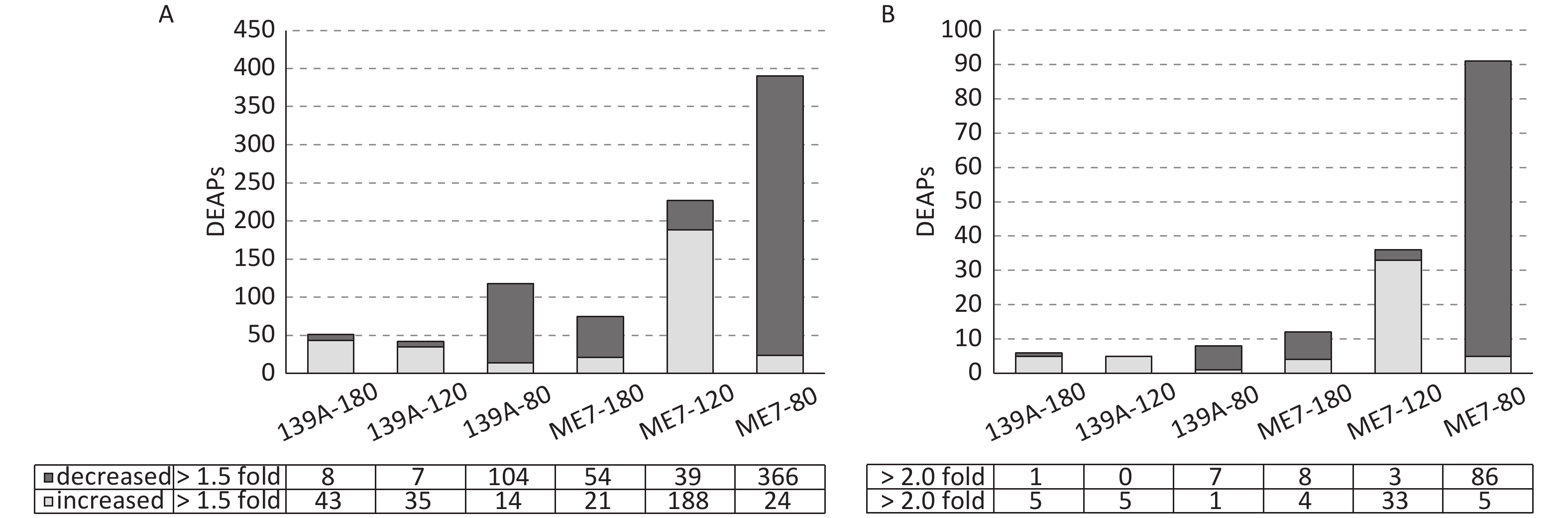 Objective To describe the global profiles of acetylated proteins in the brains of scrapie agents 139A- and ME7-infected mice collected at mid-early, mid-late, and terminal stages.Methods The acetylated proteins from the cortex regions of scrapie agent (139A- and ME7)-infected mice collected at mid-early (80 days postinfection, dpi), mid-late (120 dpi), and terminal (180 dpi) stages were extracted, and the global profiles of brain acetylated proteins were assayed with proteomic mass spectrometry. The proteins in the infected mice showing 1.5-fold higher or lower levels than that of age-matched normal controls were considered as differentially expressed acetylated peptides (DEAPs).Results A total of 118, 42, and 51 DEAPs were found in the brains of 139A-80, 139A-120, and 139A-180 dpi mice, respectively. Meanwhile, 390, 227, and 75 DEAPs were detected in the brains of ME7-80, ME7-120, and ME7-180 dpi mice, respectively. The overwhelming majority of DEAPs in the mid-early stage were down-regulated, and more portions of DEAPs in the mid-late and late stages were up-regulated. Approximately 22.1% (328/1,485) of acetylated peptides mapped to 74 different proteins were mitochondrial associated. Kyoto Encyclopedia of Genes and Genomes pathway analysis identified 39 (80 dpi), 13 (120 dpi), and 10 (180 dpi) significantly changed pathways in 139A-infected mice. Meanwhile, 55, 25, and 18 significantly changed pathways were observed in the 80, 120, and 180 dpi samples of 139A- and ME7-infected mice (P < 0.05), respectively. Six pathways were commonly involved in all tested samples. Moreover, many steps in the citrate cycle (tricarboxylic acid cycle) were affected, represented by down-regulated acetylation for relevant enzymes in the mid-early stage and up-regulated acetylation in the mid-late and late stages.Conclusion Our data here illustrated the changes in the global profiles for brain acetylated proteins during prion infection, showing remarkably inhibited acetylation in the early stage and relatively enhanced acetylation in the late stage.