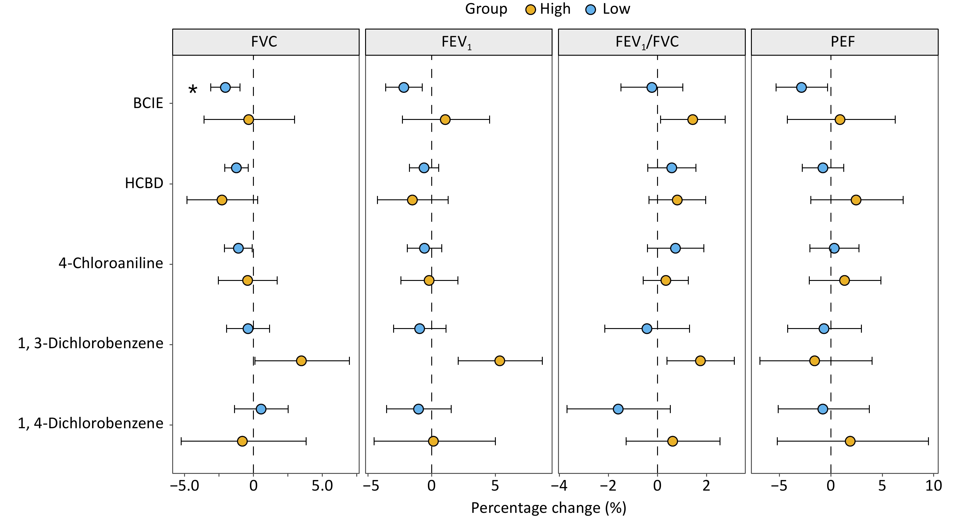 Objective To examine the mechanistic of organochlorine-associated changes in lung function.Methods This study investigated 76 healthy older adults in Jinan, Shandong Province, over a five-month period. Personal exposure to organochlorines was quantified using wearable passive samplers, while inflammatory factors and thyroid hormones were analyzed from blood samples. Participants’ lung function was evaluated. After stratifying participants according to their thyroid hormone levels, we analyzed the differential effects of organochlorine exposure on lung function and inflammatory factors across the low and high thyroid hormone groups. Mediation analysis was further conducted to elucidate the relationships among organochlorine exposures, inflammatory factors, and lung function.Results Bis (2-chloro-1-methylethyl) ether (BCIE), was negatively associated with forced vital capacity (FVC, –2.05%, 95% CI: –3.11% to –0.97%), and associated with changes in inflammatory factors such as interleukin (IL)-2, IL-7, IL-8, and IL-13 in the low thyroid hormone group. The mediation analysis indicated a mediating effect of IL-2 (15.63%, 95% CI: 0.91% to 44.64%) and IL-13 (13.94%, 95% CI: 0.52% to 41.07%) in the association between BCIE exposure and FVC.Conclusion Lung function and inflammatory factors exhibited an increased sensitivity to organochlorine exposure at lower thyroid hormone levels, with inflammatory factors potentially mediating the adverse effects of organochlorines on lung function.