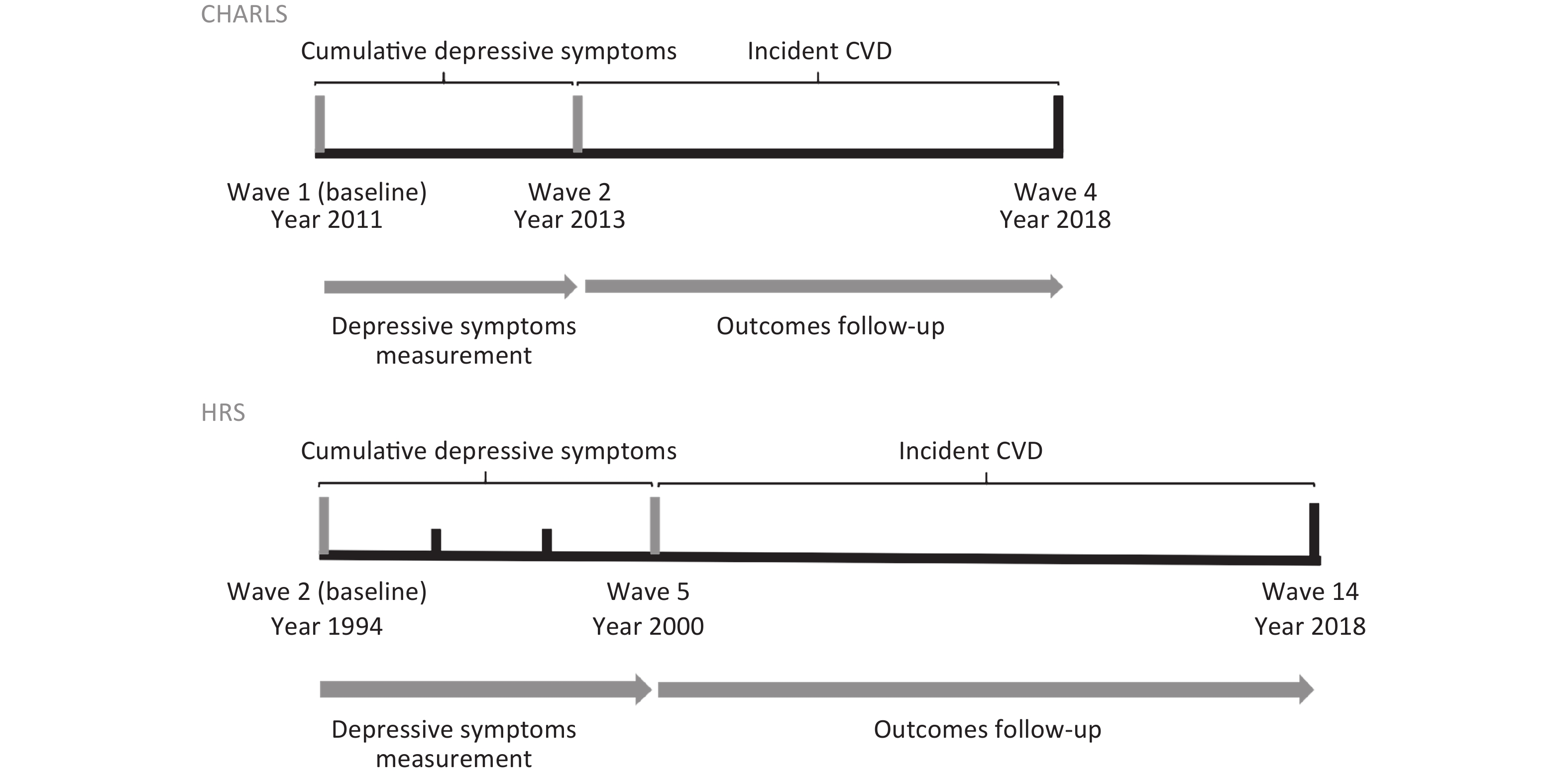 Objective Elevated depressive symptoms are well-documented among geriatric adults with cardiovascular disease (CVD); however, few studies have accounted for long-term cumulative depressive symptom exposure. This study determined the relationship between cumulative depressive symptoms and CVD.Methods Individual participant data were obtained from the China Health and Retirement Longitudinal Study (CHARLS) and Health and Retirement Study (HRS). Eligible participants had access to assessment information on depressive symptoms and had no history of CVD at baseline. Long-term cumulative depressive symptoms were estimated by calculating the area under the curve based on the Center for Epidemiological Studies Depression Scale.Results Herein, 8,861 participants from CHARLS (mean age: 58.58 years; male: 48.6%) and 7,284 from HRS (60.94 years; 35.0%) were enrolled. The median follow-up period was 5 years for the CHARLS and 10 years for the HRS. Compared with the first quartile of cumulative depressive symptoms, the HRs (95% CI) in the fourth quartile were 1.73 (1.48, 2.02) for predicting CVD (P < 0.001), 1.83 (1.52, 2.19) for heart disease (P < 0.001), 1.53 (95% CI: 1.17, 1.99) for stroke (P = 0.002) in CHARLS. For HRS, the HRs (95% CI) were 1.41 (95% CI: 1.27, 1.57; P < 0.001), 1.42 (95% CI: 1.26, 1.59; P < 0.001), and 1.30 (95% CI: 1.06, 1.58; P = 0.010) respectively. Strong dose-response relationships were observed, with similar results for the two cohorts. Conclusion Long-term cumulative depressive symptoms were significantly associated with incident CVD in middle-aged and older adults, providing insights into controlling long-term depressive symptoms to improve this cohort’s health.