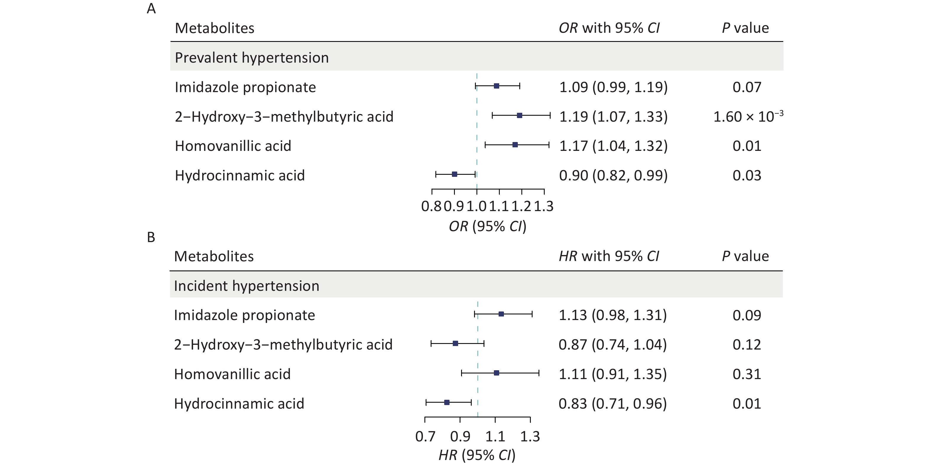 Objective Evidence suggests that depleted gut microbial α-diversity is associated with hypertension; however, whether metabolic markers affect this relationship remains unknown. We aimed to determine the potential metabolites mediating the associations of α-diversity with blood pressure (BP) and BP variability (BPV).Methods Metagenomics and plasma targeted metabolomics were conducted on 523 Chinese participants from the MetaSalt study. The 24-hour, daytime, and nighttime BP and BPV were calculated based on ambulatory BP measurements. Linear mixed models were used to characterize the relationships between α-diversity (Shannon and Chao1 index) and BP indices. Mediation analyses were performed to assess the contribution of metabolites to the observed associations. The influence of key metabolites on hypertension was further evaluated in a prospective cohort of 2,169 participants.Results Gut microbial richness (Chao1) was negatively associated with 24-hour systolic BP, daytime systolic BP, daytime diastolic BP, 24-hour systolic BPV, and nighttime systolic BPV (P < 0.05). Moreover, 26 metabolites were strongly associated with richness (Bonferroni P < 0.05). Among them, four key metabolites (imidazole propionate, 2-hydroxy-3-methylbutyric acid, homovanillic acid, and hydrocinnamic acid) mediated the associations between richness and BP indices (proportions of mediating effects: 14.1%–67.4%). These key metabolites were also associated with hypertension in the prospective cohort. For example, each 1-standard deviation unit increase in hydrocinnamic acid significantly reduced the risk of prevalent (OR [95% CI] = 0.90 [0.82, 0.99]; P = 0.03) and incident hypertension (HR [95% CI] = 0.83 [0.71, 0.96]; P = 0.01).Conclusion Our results suggest that gut microbial richness correlates with lower BP and BPV, and that certain metabolites mediate these associations. These findings provide novel insights into the pathogenesis and prevention of hypertension.