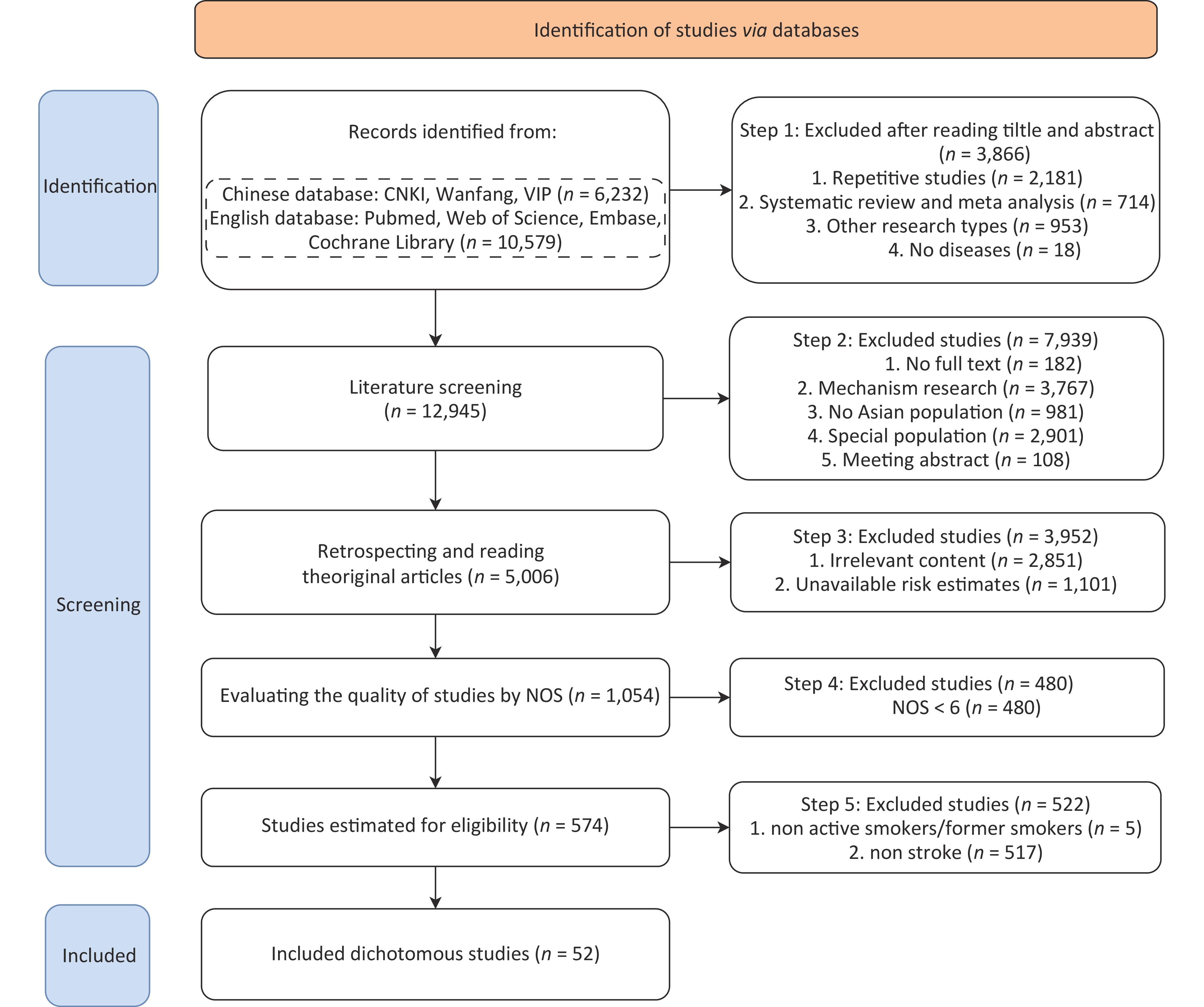 Objective Stroke is the third leading cause of death worldwide, with the highest incidence in Asia, particularly in China, where smoking remains a major risk factor. The smoking prevalence in China is similar to that in Asia. Whether the risk estimates for smoking-related stroke in China and all Asian countries are still unknown which is worth evaluating. Thus, this study aims to compare the Relative Risk (RR) of smoking-attributed stroke among the Chinese and Asian populations.Methods A literature search was conducted from the inception to September 10, 2022. Studies meeting the criteria were included. The articles were screened, and related information was extracted. Pooled RRs stratified by smoking status and sex were analyzed, including subgroup analyses for China, other Asian countries, and Asia overall. Finally, publication bias and sensitivity analyses were conducted.Results Thirty-seven articles on the Chinese population and 15 on other Asian populations were included, with a mean Newcastle-Ottawa scale (NOS) score of 7.25. About ever smokers, there had no statistical difference existed in both sexes and females between China and other Asian countries, while the RR of males in other Asian countries [2.31 (1.38, 3.86)] was higher than that in China [1.21 (1.15, 1.26)]; further subgroup analysis indicated that other Asian countries had higher RR [3.76 (3.02, 4.67)] in the morbidity subgroup. The RRs of both sexes, males and females, between China and the whole of Asia were not statistically different. As for current and former smokers, no meaningful statistical difference was observed in the pooled RRs of both sexes, males and females, in China, other Asian countries, and all of Asia.Conclusion The RR of males ever smokers in China was smaller than that in other Asian countries due to the few articles of morbidity subgroup, but had no statistical difference with the whole of Asia; other groups of ever smokers, current smokers, and former smokers were not statistically significant with other Asian countries or the whole of Asia.