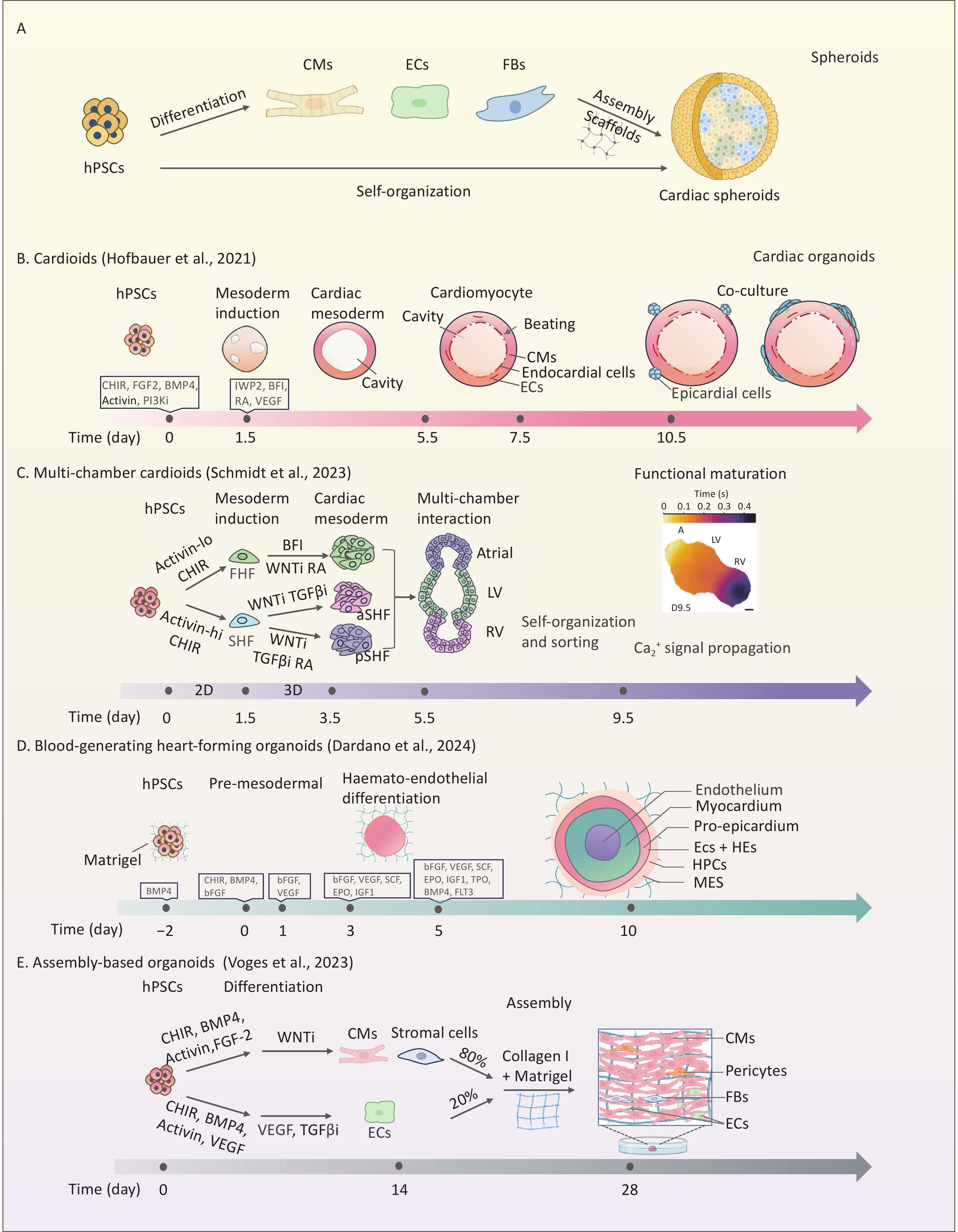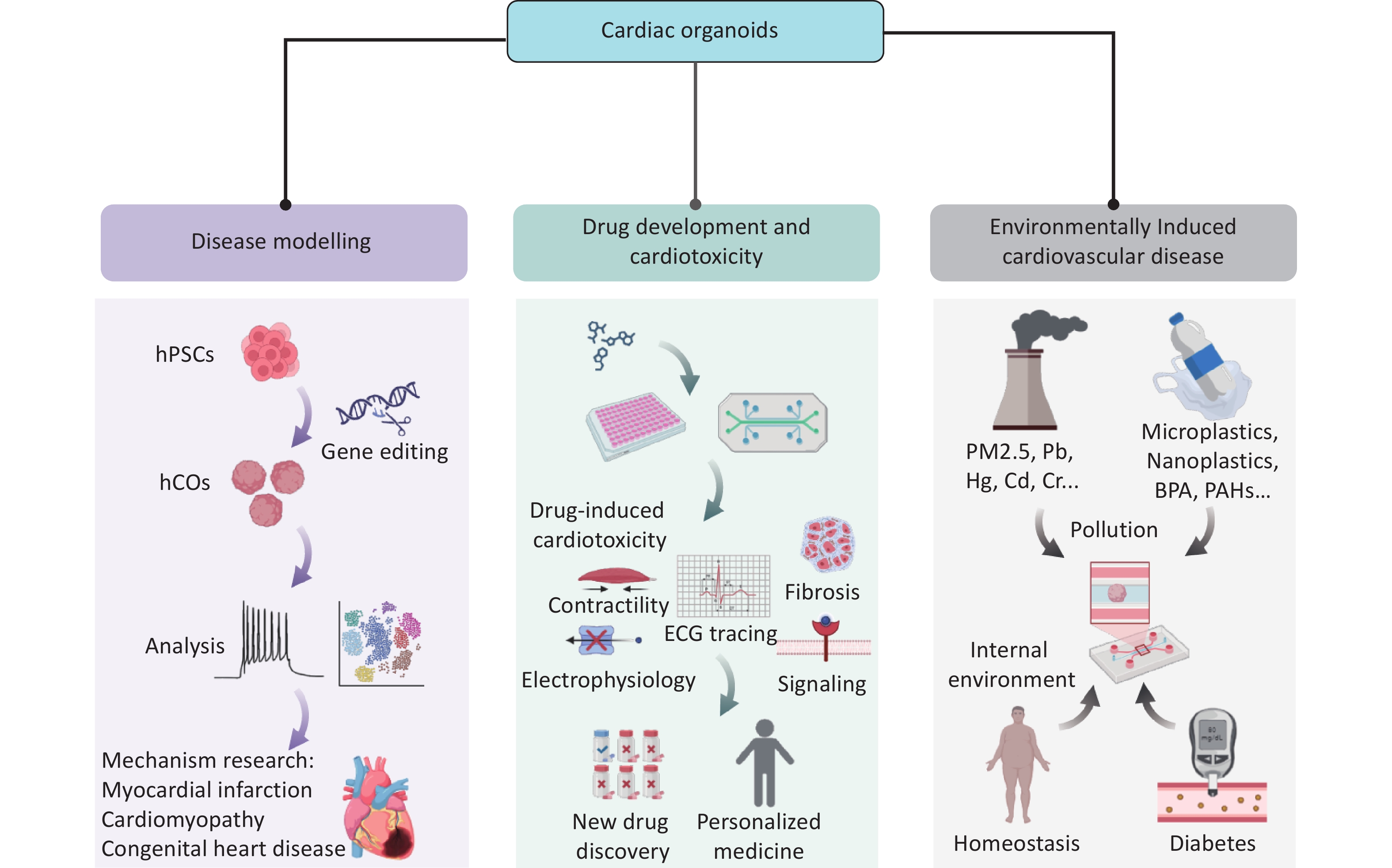 Human cardiac organoids have revolutionized the study of cardiac development, disease modeling, drug discovery, and regenerative therapies. This review systematically discusses strategies and progress in the construction of cardiac organoids, categorizing them into three main types: cardiac spheroids, self-organizing/assembloid organoids, and organoid-on-a-chip systems. This review uniquely integrates the advances in vascularization, organ-on-chip design, and environmental cardiotoxicity modeling within cardiac organoid platforms, offering a critical synthesis that is absent in the literature. In the context of escalating environmental threats to cardiovascular health, there is an urgent need for physiologically relevant models to accurately identify cardiac toxicants and elucidate their underlying mechanisms of action. This review highlights advances in cardiac organoid applications for disease modeling—including congenital heart defects and acquired cardiovascular diseases—drug development, toxicity screening, and the study of environmentally induced cardiovascular pathogenesis. In addition, it critically examines ongoing challenges and underscores opportunities brought by bioengineering approaches. Finally, we propose future directions for developing standardized cardiac organoid platforms with clinical predictability, aiming to expand the utility of this technology across broader research applications.