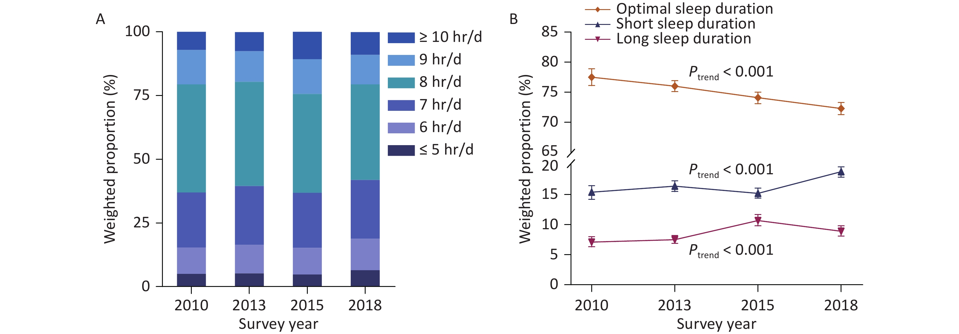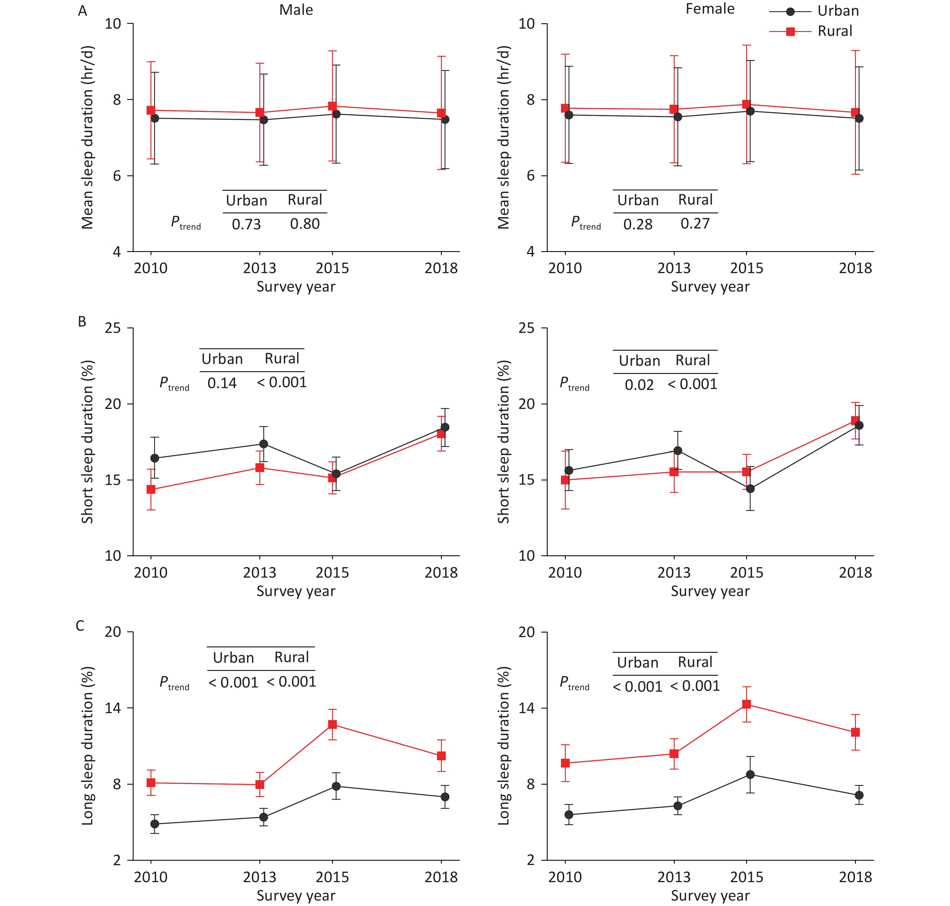 Objective This study aimed to determine the temporal trends in sleep duration among Chinese adults.Methods In this series of repeated nationally representative cross-sectional surveys (China Chronic Disease and Risk Factors Surveillance) conducted between 2010 and 2018, a total of 645,420 adult participants (97,741 in 2010; 175,749 in 2013; 187,777 in 2015; and 184,153 in 2018) were included in the trend analysis. Linear and logistic regression models were utilized to assess trends in sleep duration.Results In 2018, the estimated overall mean sleep duration among the Chinese adult population was 7.58 (SD, 1.45) hours per day, with no significant trend from 2010. A significant increase in short sleep duration (≤ 6 hours) was observed in the total population, from 15.3% (95% CI: 14.1%–16.5%) in 2010 to 18.5% (95% CI: 17.7%–19.3%) in 2018 (P < 0.001). Similarly, the trend in long sleep duration (> 9 hours) was also significant, increasing in weighted prevalence from 7.2% (95% CI: 6.3%–8.1%) in 2010 to 9.0% (95% CI: 8.2%–9.9%) in 2018 (P < 0.001).Conclusion The prevalence of both short and long sleep durations significantly increased among Chinese adults from 2010 to 2018, highlighting the urgency of health initiatives to promote optimal sleep duration in China.