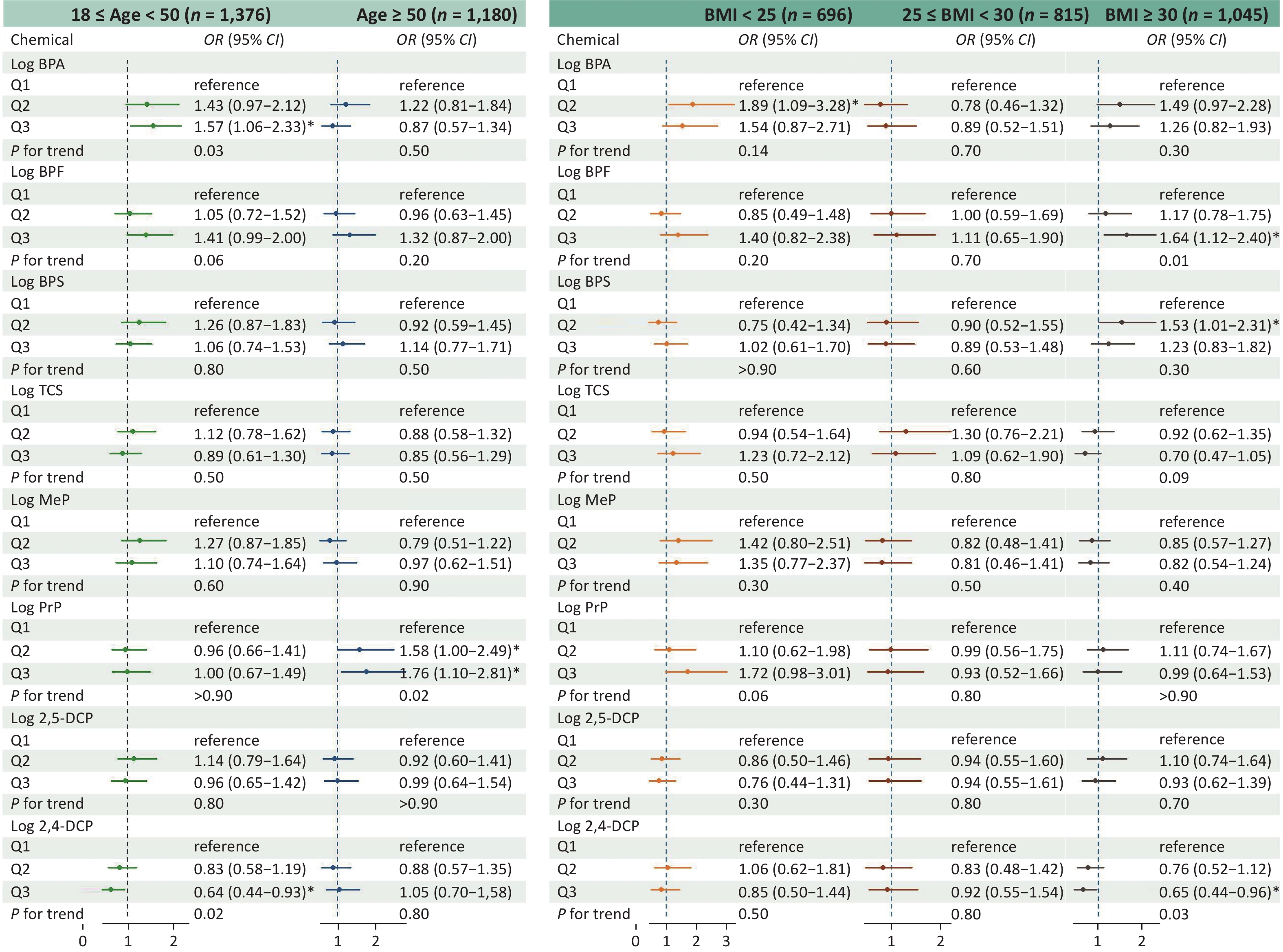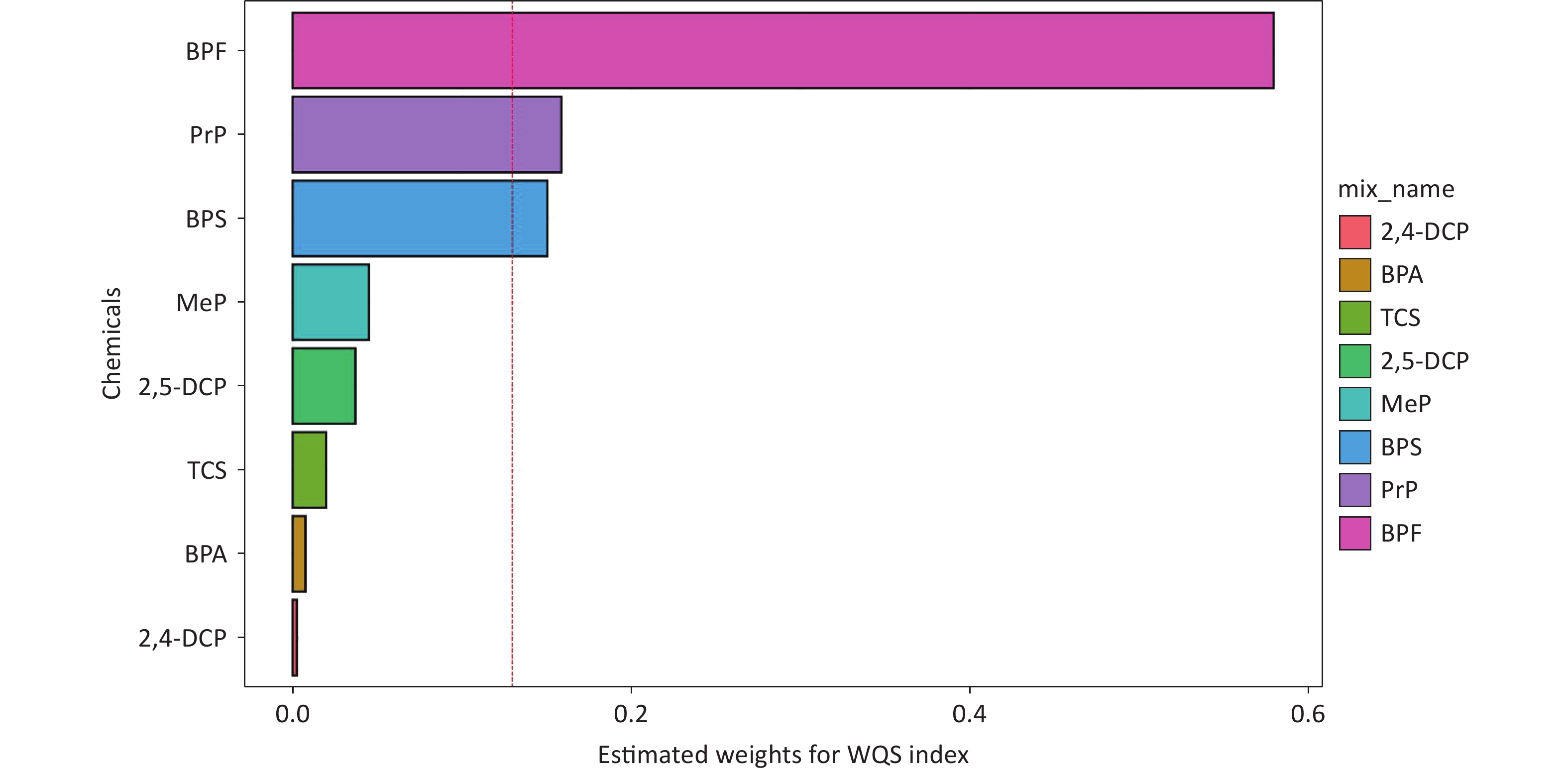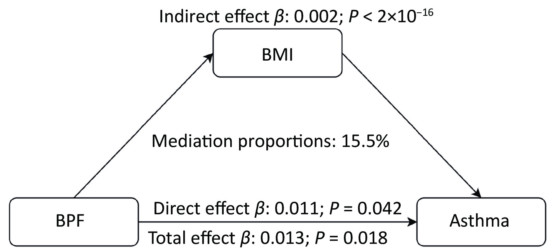 Objective Exposure to mixtures of environmental chemicals may influence asthma outcomes; however, the evidence remains equivocal. This study aimed to assess the association between mixed exposure to phenols and parabens and asthma outcomes in adults and to explore the mediating role of body mass index (BMI).Methods Based on data from the National Health and Nutrition Examination Survey (NHANES, 2013–2016), this study used multivariate generalized linear regression and weighted quantile sum (WQS) regression models to evaluate the associations between individual and joint exposure to phenols and parabens and asthma outcomes. These associations were further analyzed and stratified according to age and BMI. A mediation effect analysis was used to assess the role of BMI in this association.Results This study included 2,556 adults, of whom 400 (15.7%) were diagnosed with asthma. After adjusting for all covariates, a significant positive correlation was observed between the chemical mixture and asthma, with an odds ratio of 1.33 (95% confidence interval, 1.06–1.68). Among the eight phenols and parabens, bisphenol F (BPF), propylparaben (PrP), and bisphenol S (BPS) were the major contributors. Additionally, BMI mediated 15.5% of the association between BPF exposure and asthma.Conclusion In this cross-sectional study, mixed exposure to phenols and parabens was significantly associated with asthma outcomes, with BPF, PrP, and BPS identified as the primary contributing chemicals. This study provides valuable insights into the association between mixed chemical exposure and asthma as well as potential control pathways.