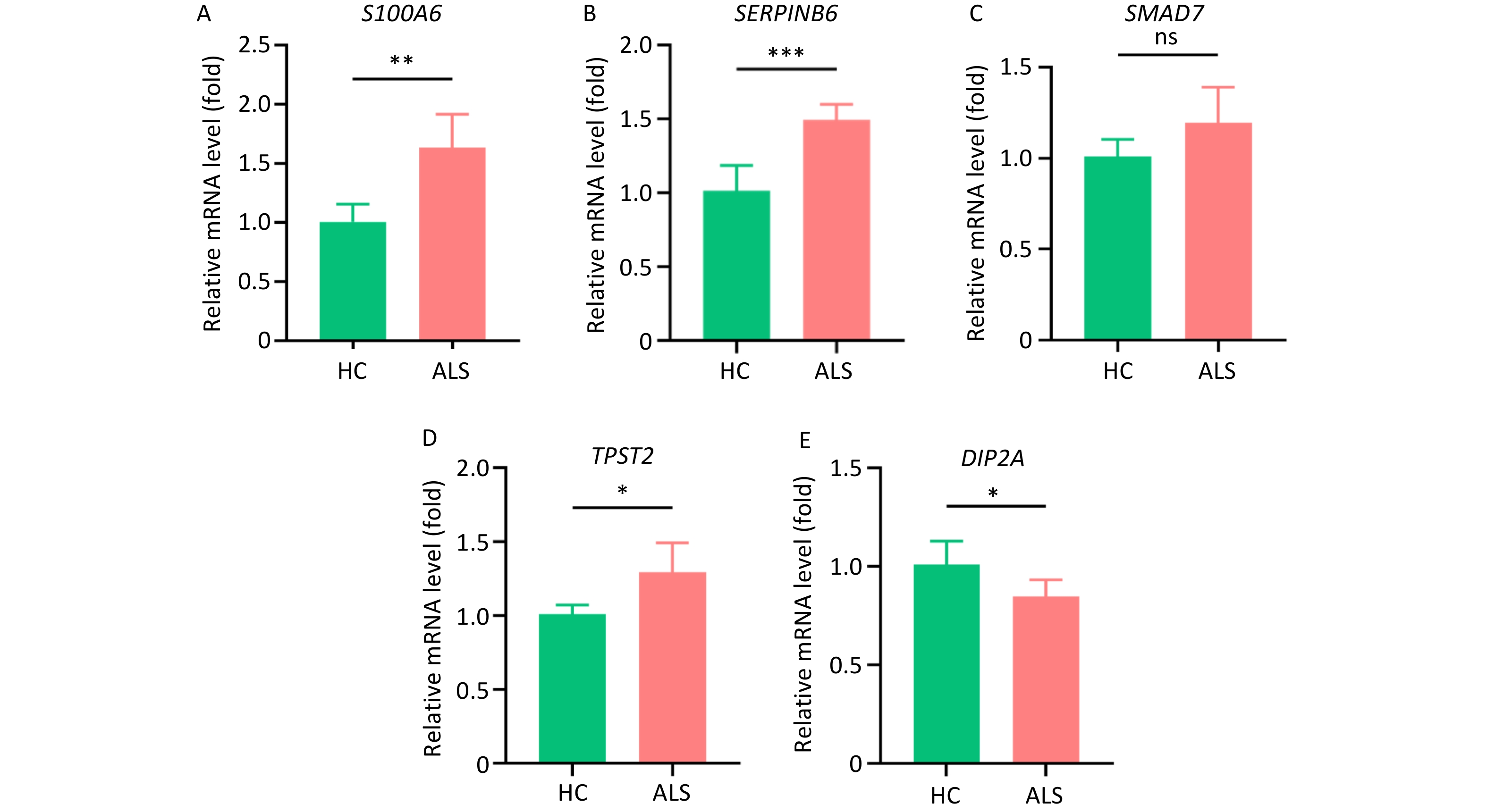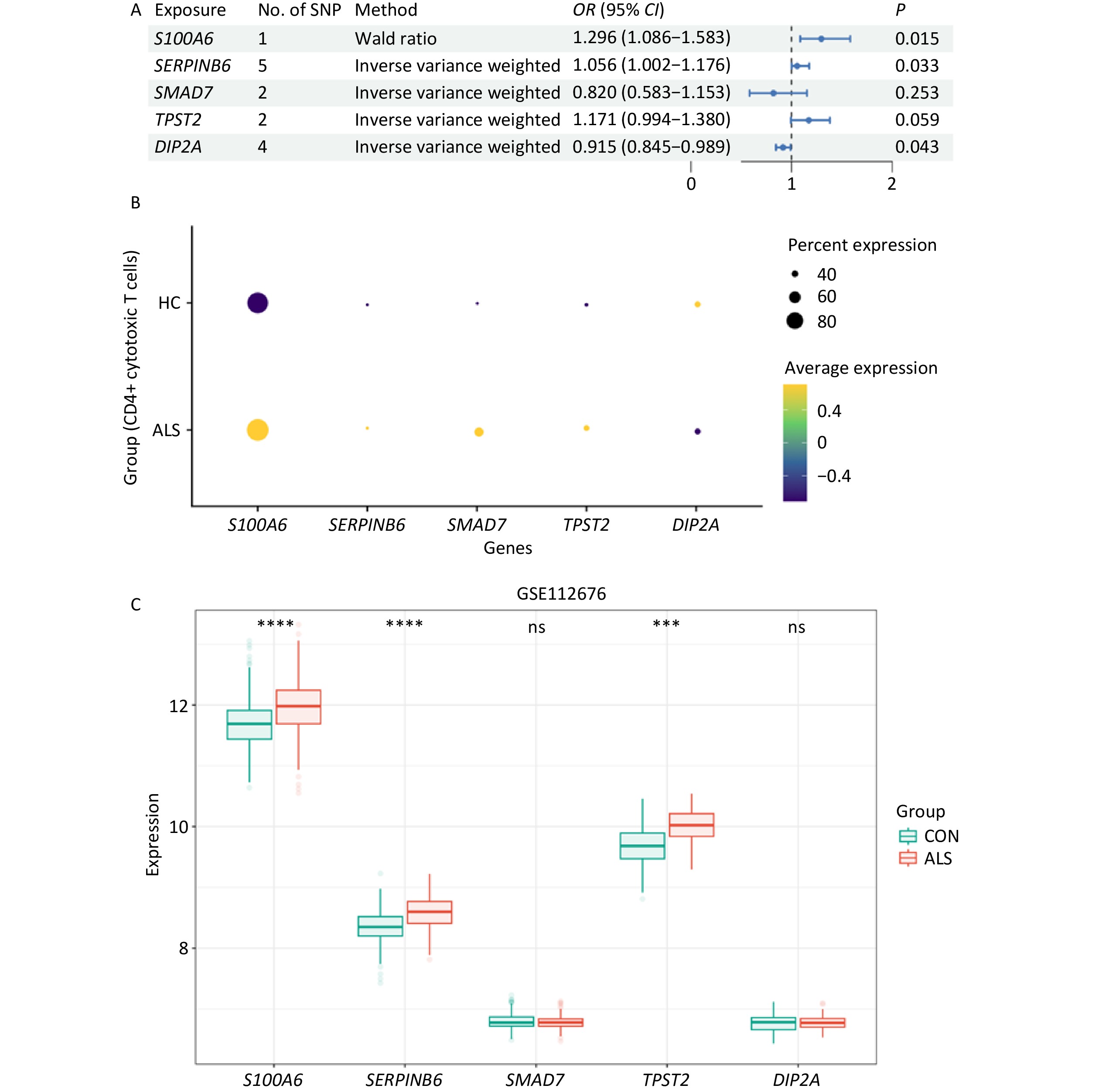 Objective Adaptive immune responses play a critical role in the pathogenesis of amyotrophic lateral sclerosis (ALS). In this study, we investigated the functional mechanisms of T cell subtypes and assessed the causal links between CD4+ cytotoxic T cell-related genes and ALS risk.Methods Single-cell RNA sequencing (scRNA-seq) of peripheral blood mononuclear cells (PBMCs) from patients with ALS and healthy controls (HC) was used to identify differentially expressed genes (DEGs) in CD4+ cytotoxic T cells. Comprehensive analyses of CD4+ cytotoxic T cells, including pseudotemporal trajectory, intercellular communication, and metabolic pathway analysis, were performed. Mendelian randomization (MR) analysis evaluated the causal effects of DEGs on ALS risk, with validation using independent genome-wide association study (GWAS) data. Expression patterns of the causal genes were further verified using scRNA-seq, bulk-seq, and clinical samples.Results CD4+ cytotoxic T cells were significantly expanded in patients with ALS. The upregulated genes S100A6, SERPINB6, SMAD7, and TPST2 were positively correlated with ALS susceptibility, whereas DIP2A showed a protective association.ConclusionS100A6, SERPINB6, SMAD7, TPST2, and DIP2A were identified as causal genes and potential therapeutic targets in ALS, implicating CD4+ cytotoxic T cells in the disease mechanisms. Further studies targeting these genes and neuroinflammatory pathways are warranted.