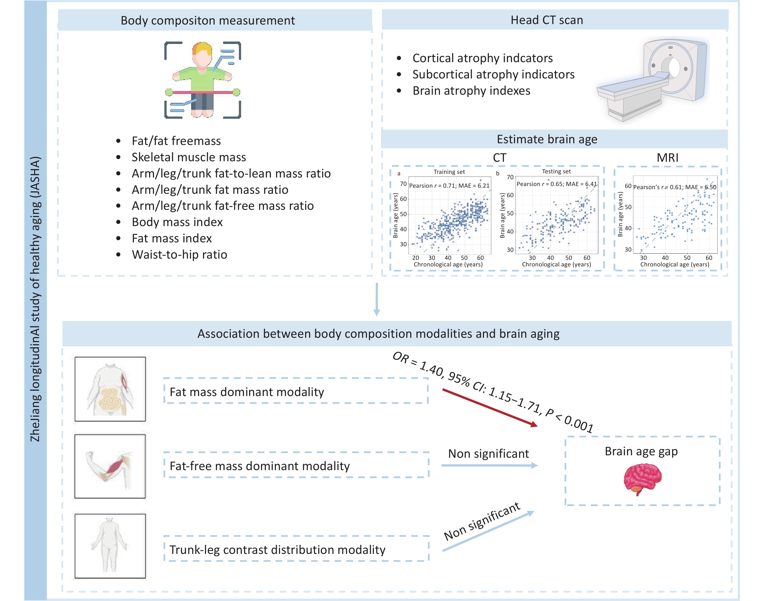 Objective This study examined the associations between multidimensional body composition modalities and brain aging in Chinese adults.Methods Brain age was estimated using ridge regression based on 24 head computed tomography-derived neuroanatomical indicators in a Chinese cohort (n = 557). Brain age gap (BAG), the deviation between the predicted brain age and chronological age (CA), was categorized into brain age acceleration (BAG > 0) and deceleration (BAG < 0) groups. Principal component analysis of 22 correlation-independent body composition indicators identified different body composition modalities. Logistic regression was used to examine the associations between these modalities and the BAG groups.Results The mean absolute error of brain age in predicting CA was 6.41 years. Three body composition modalities were identified: fat mass dominant (characterized by high loading coefficients of body fat mass, fat mass index, visceral fat level, and fat-to-lean mass ratio); fat-free mass dominant; and trunk-leg contrast distribution. The fat mass dominant modality was significantly associated with brain age acceleration (odds ratio [OR] = 1.40, 95% confidence interval [CI]: 1.15‒1.71), and the association was robust in sensitivity analyses.Conclusion The fat mass dominant modality was significantly associated with accelerated brain aging. This study suggests integrating deep body composition indicators into clinical and community health screening could aid in targeted prevention of brain aging.