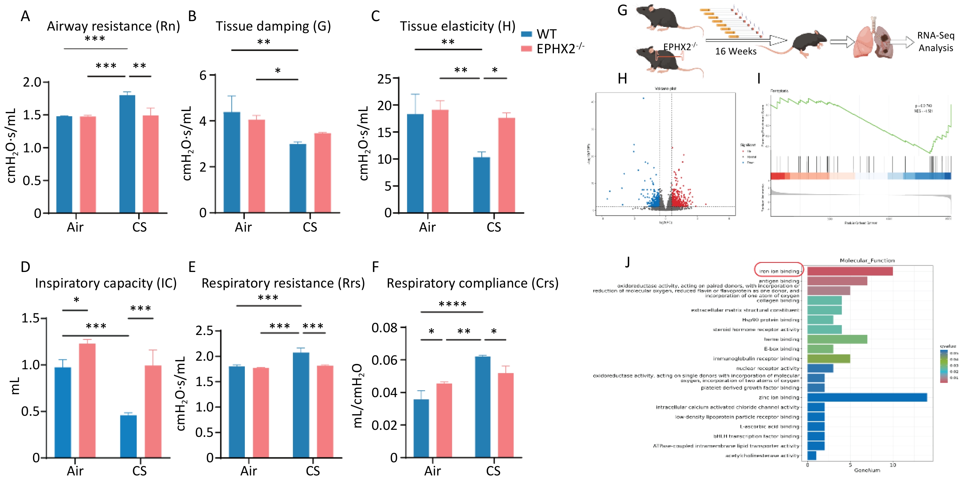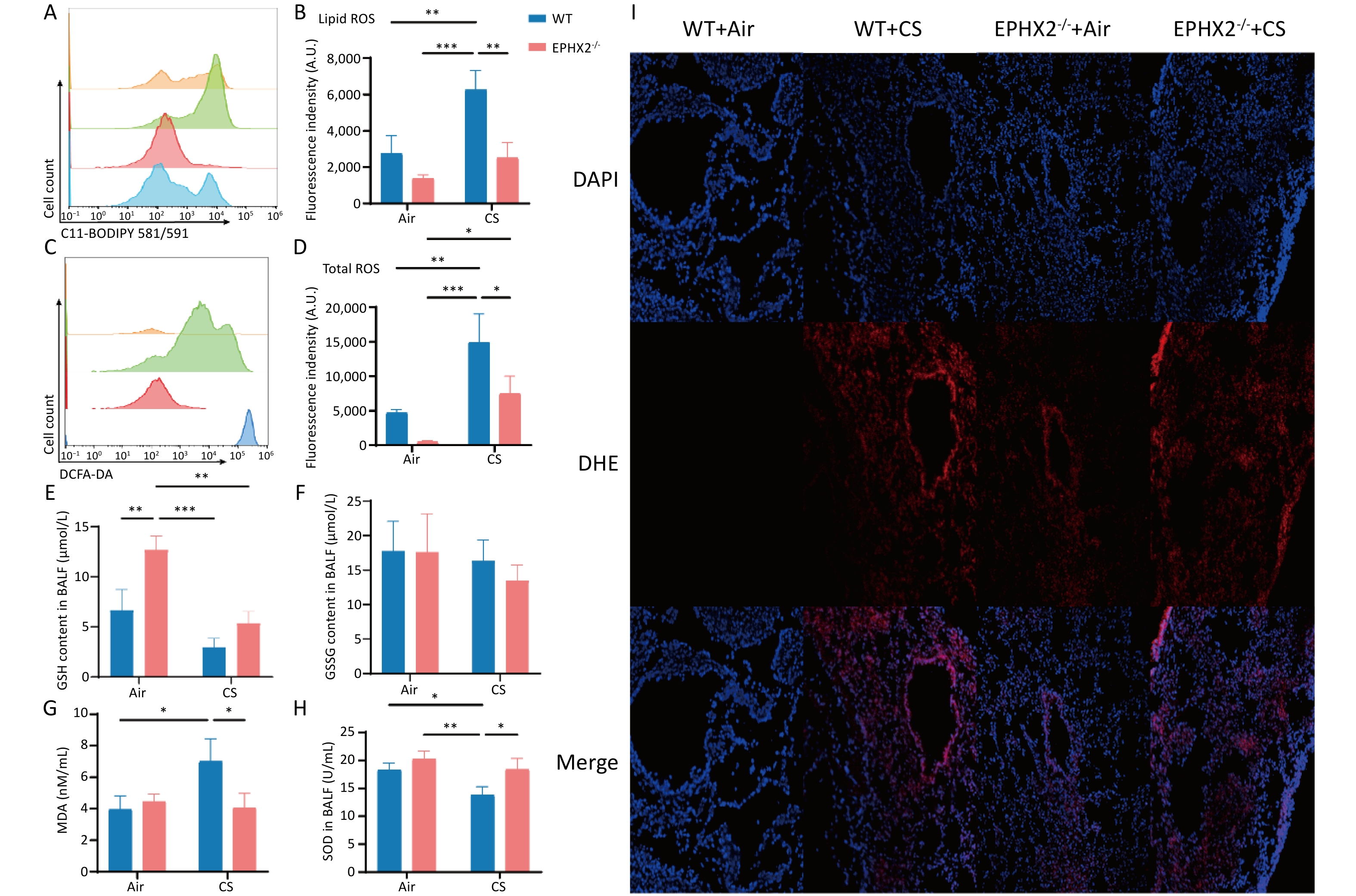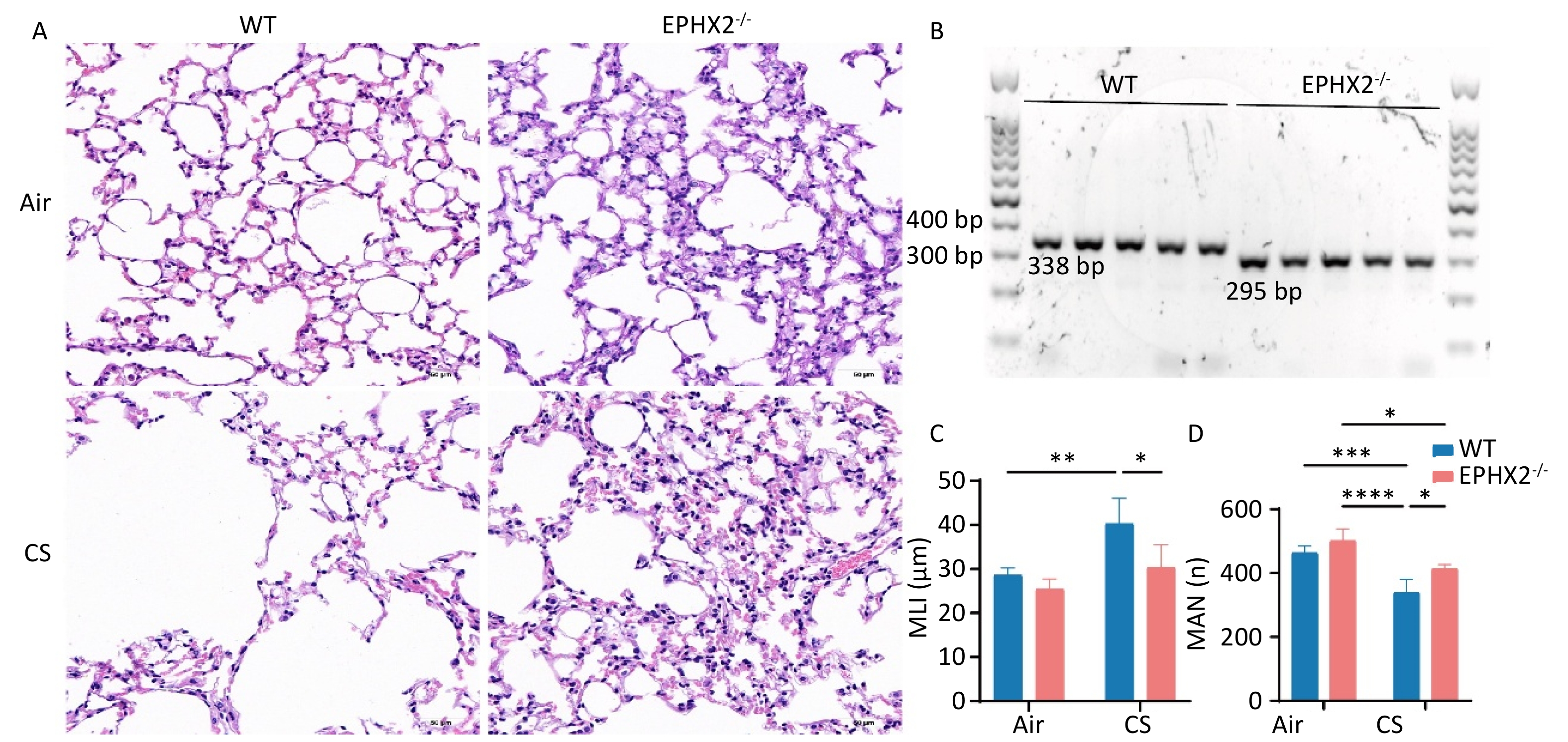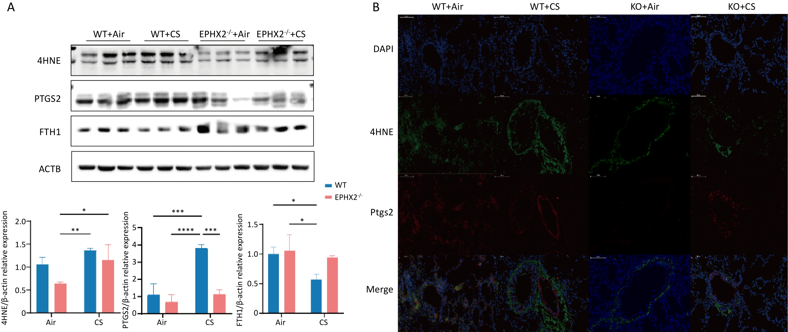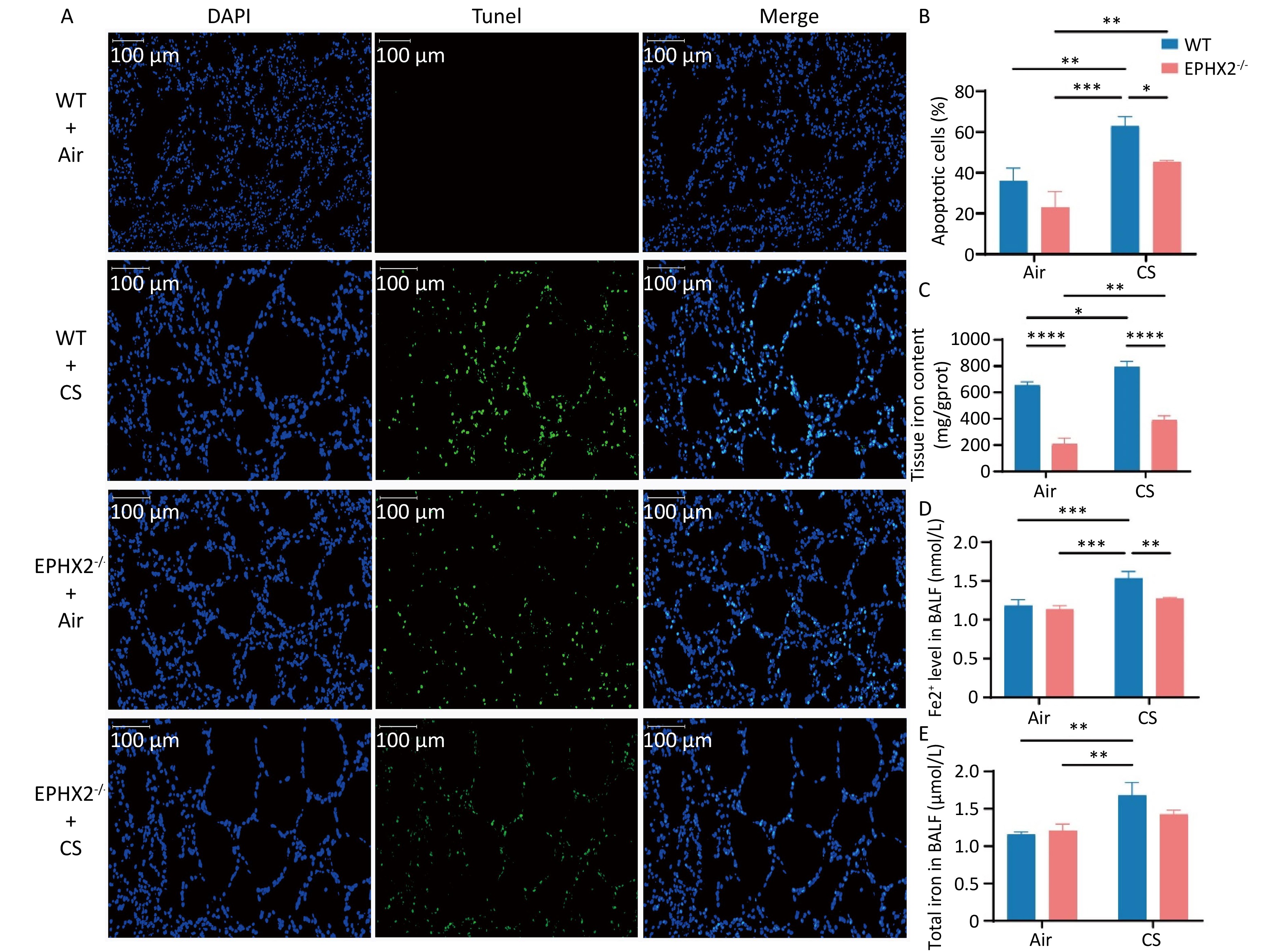 Objective This study investigated the effect of reducing soluble epoxide hydrolase (sEH, encoded by the Ephx2 gene) on the mediation of EETs metabolism during ferroptosis in emphysema in vivo.Methods Male C57BL/6J wild-type (WT) and Ephx2-/- mice received whole-body exposure to either cigarette smoke (CS) or air for 16 weeks. The alveolar structure, pulmonary function, lung tissue morphology, cell death, and ferroptosis levels were assessed following exposure.Results CS exposure caused emphysema, reduced pulmonary function, and induced ferroptosis in mice compared with exposure to air. In contrast, following CS exposure, Ephx2-/- mice exhibited significantly lower levels of emphysema, impaired lung function, lung cell death, intracellular iron, lipid reactive oxygen species, cyclooxygenase-2, 4-hydroxynonenal, and malondialdehyde levels than those of WT mice. However, Ephx2-/- mice exhibited higher levels of glutathione and ferritin heavy chain 1 than those of WT mice. SLC7A11 expression was significantly reduced, whereas glutathione peroxidase 4 expression was markedly increased in Ephx2-/- mice compared with WT mice. Statistically significant differences (P < 0.05) were observed.Conclusion These results suggest that Ephx2 deficiency inhibits ferroptosis to alleviate CS-induced emphysema, primarily by mitigating its inhibitory effect on the cystine/glutathione/glutathione peroxidase 4 axis. Therefore, Ephx2 represents an effective therapeutic target in CS-induced chronic obstructive pulmonary disease (COPD).
