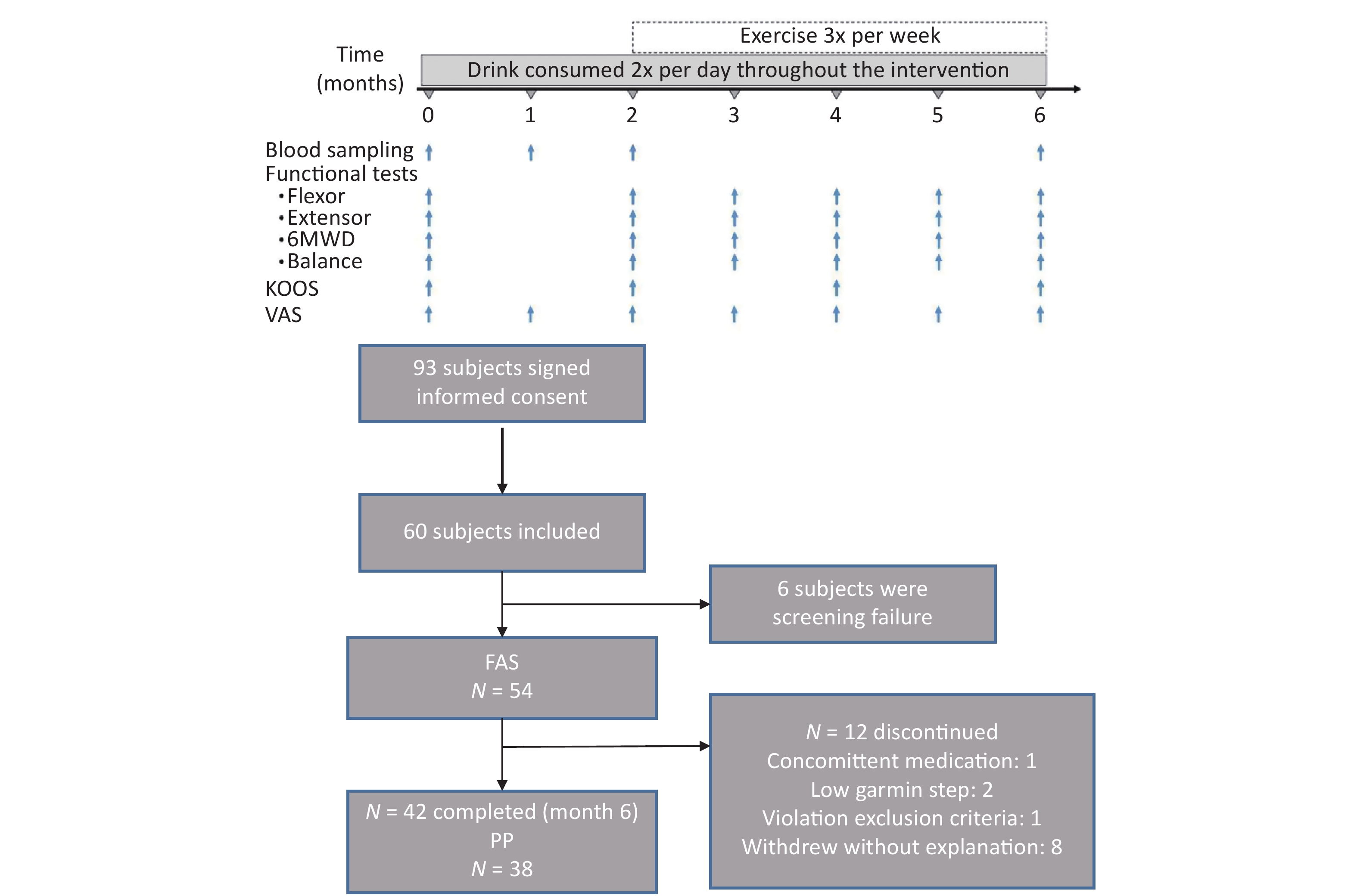 During the trial period, a total of seven visits were performed, including baseline (V0), month 1 (V1), month 2 (V2), month 3 (V3), month 4 (V4), month 5 (V5), and month 6 (V6) visits. Co-primary outcomes included the 6-Minute Walking Test and isokinetic strength. Secondary outcomes included the balance test, serum biomarkers of bone, joint, and inflammation, Vitamin D, and patient-reported questionnaires such as Visual Analog Scale (VAS) and Knee injury and OA Outcome Score (KOOS).