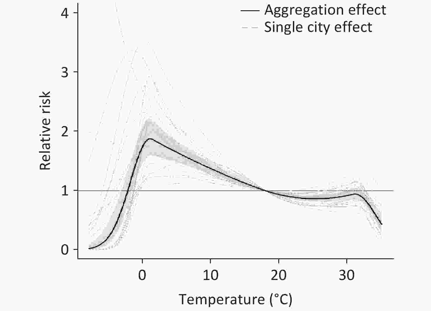 • Cochran’s Q test and the I2 statistic for heterogeneity with Q = 418.296 (P < 0.001) indicating a high heterogeneity of the meta-regression model and a high degree of heterogeneity (I2 = 72.5%). The random-effects meta-analysis suggested a nonlinear relationship between temperature and HFMD transmission, with two peaks of RR at 1.30 °C (1.834, 95% CI: 1.204–2.794) and 31.4 °C (1.143, 95% CI: 0.901–1.451), forming an M shape (Figure 7). The exposure-response relationship in each city and the overall curve of the 26 cities showed a similar trend, with the first peak being higher than the latter. The most significant effect of temperature on HFMD was at –2 to 18.1 °C. Our analysis uncovered a striking consistency in the exposure-response relationship between temperature and HFMD, as evident in both the individual city summary curves and the combined curve encompassing all 26 cities. Notably, the initial peaks in these curves were markedly more pronounced than any subsequent peaks, suggesting a robust pattern of how temperature modulates the transmission dynamics of HFMD. Despite the heterogeneity observed across the study, this consistency underscores the existence of fundamental commonalities in the mechanisms by which temperature influences the spread of HFMD.