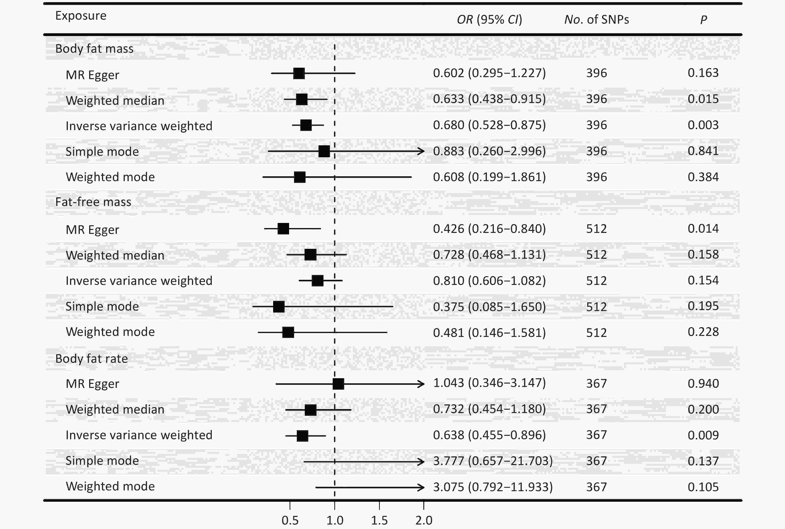 We conducted a series of sensitivity analyses to assess heterogeneity and pleiotropy (Supplementary Table S5). The Cochran’s Q test suggested the existence of heterogeneity in FM (P < 0.001), FFM (P = 0.003), and BF% (P = 0.002). Therefore, the random effect model was employed to estimate the effect size (Supplementary Table S6). Similar effect sizes as the primary finding were obtained from the random effects models (FM: OR = 0.680, 95% CI: 0.528–0.875, P = 0.003; BF%: OR = 0.638, 95% CI: 0.455–0.896, P = 0.009).