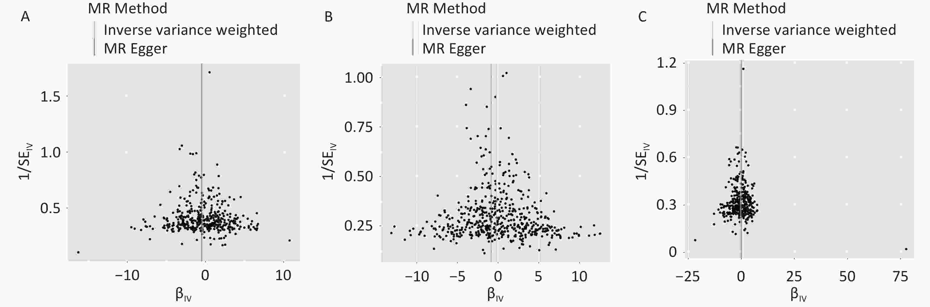 Figure 3. Funnel plot for the causal effects of (A) body fat mass, (B) fat-free mass, and (C) body fat percentage on obsessive-compulsive disorder. IV, instrumental variable; SE, standard error; MR, Mendelian randomization.