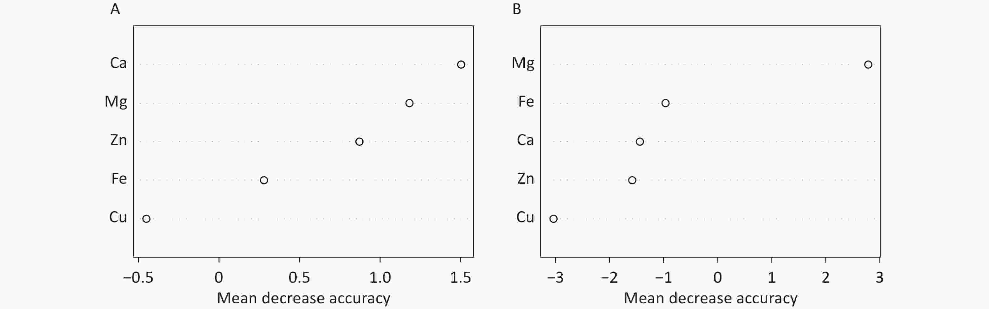 The random forest machine learning prediction model was applied to evaluate the influence of serum trace elements on the total ALSFRS-R score and disease progression. The results indicated that the Ca and Mg levels had a greater influence on the total ALSFRS-R score, with a mean decrease accuracy (MDA) score > 1. In addition, the serum Mg level had a substantial effect on disease progression, with an MDA score > 2 (Figure 2).