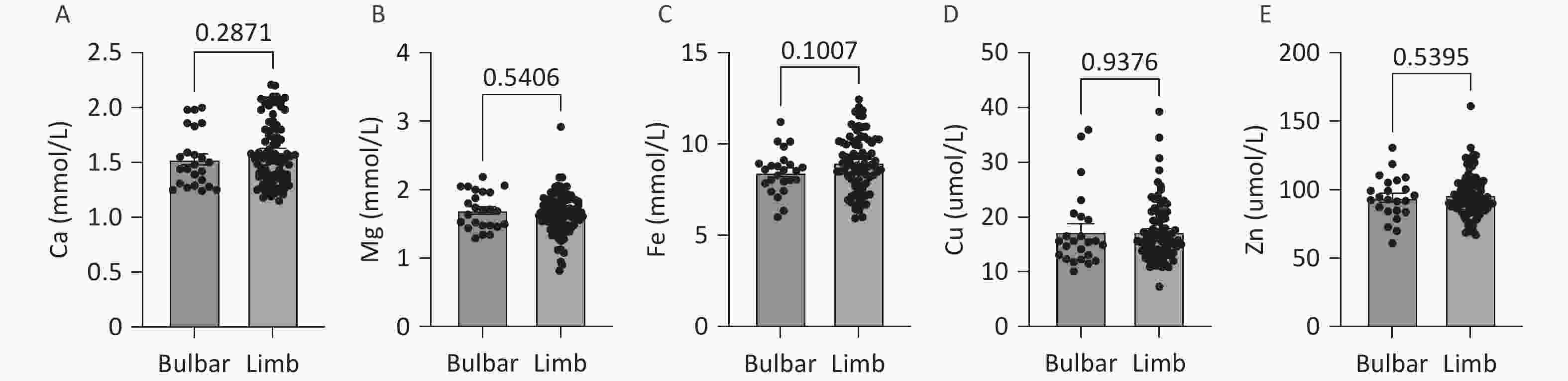 No significant differences in the levels of serum trace elements (Ca, Mg, Fe, Cu, and Zn) were observed between patients with different sites of onset (medulla oblongata onset or limb onset) (Figure 3).