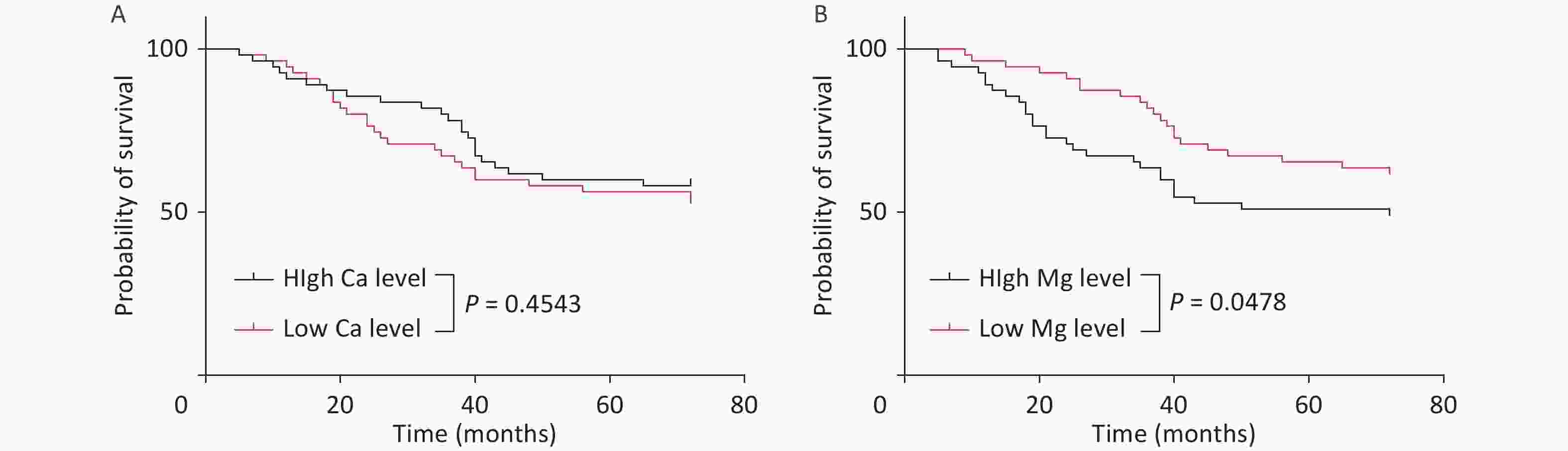 Survival analysis was performed by stratifying the cohort into low- and high-serum-trace-element-concentration groups based on the median values. While the serum Ca level had no significant impact on survival time, patients with low Mg levels showed significantly prolonged survival (P < 0.05) (Figure 4).