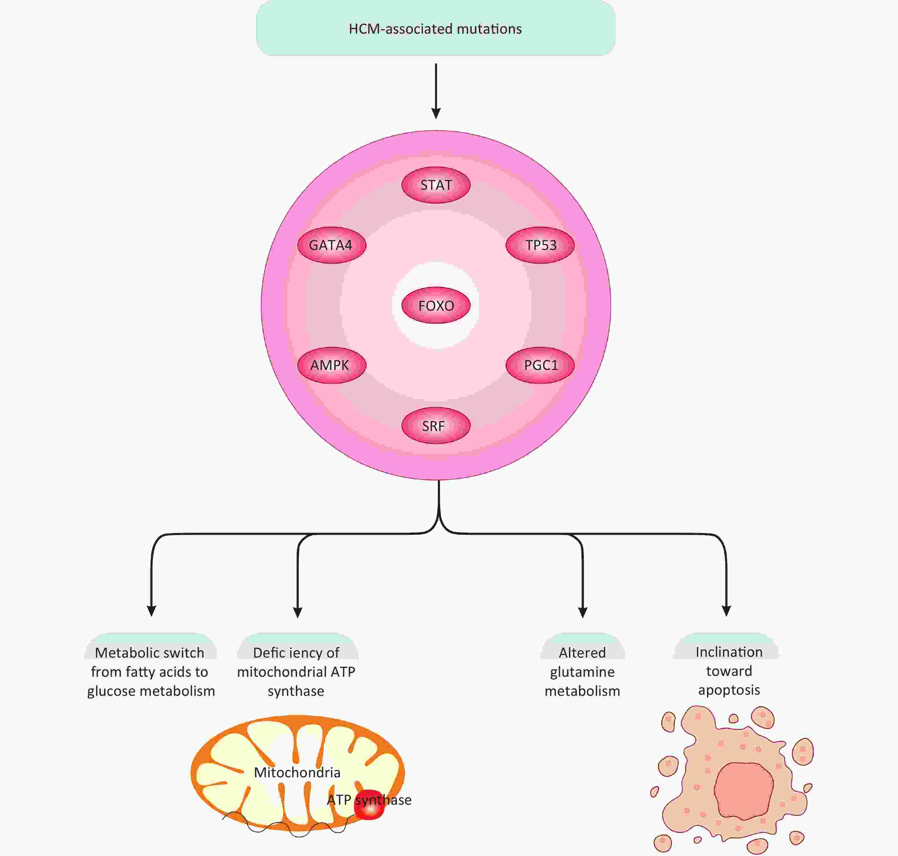 Figure 3. HCM-associated mutations, signaling molecules, and transcription factors. HCM-associated mutations through modulation of multiple transcription factors and signaling molecules can ultimately change glucose, fatty acids, and amino acid metabolism, mitochondrial ATP production, and apoptotic fate in cardiomyocytes, all linked with HCM development.