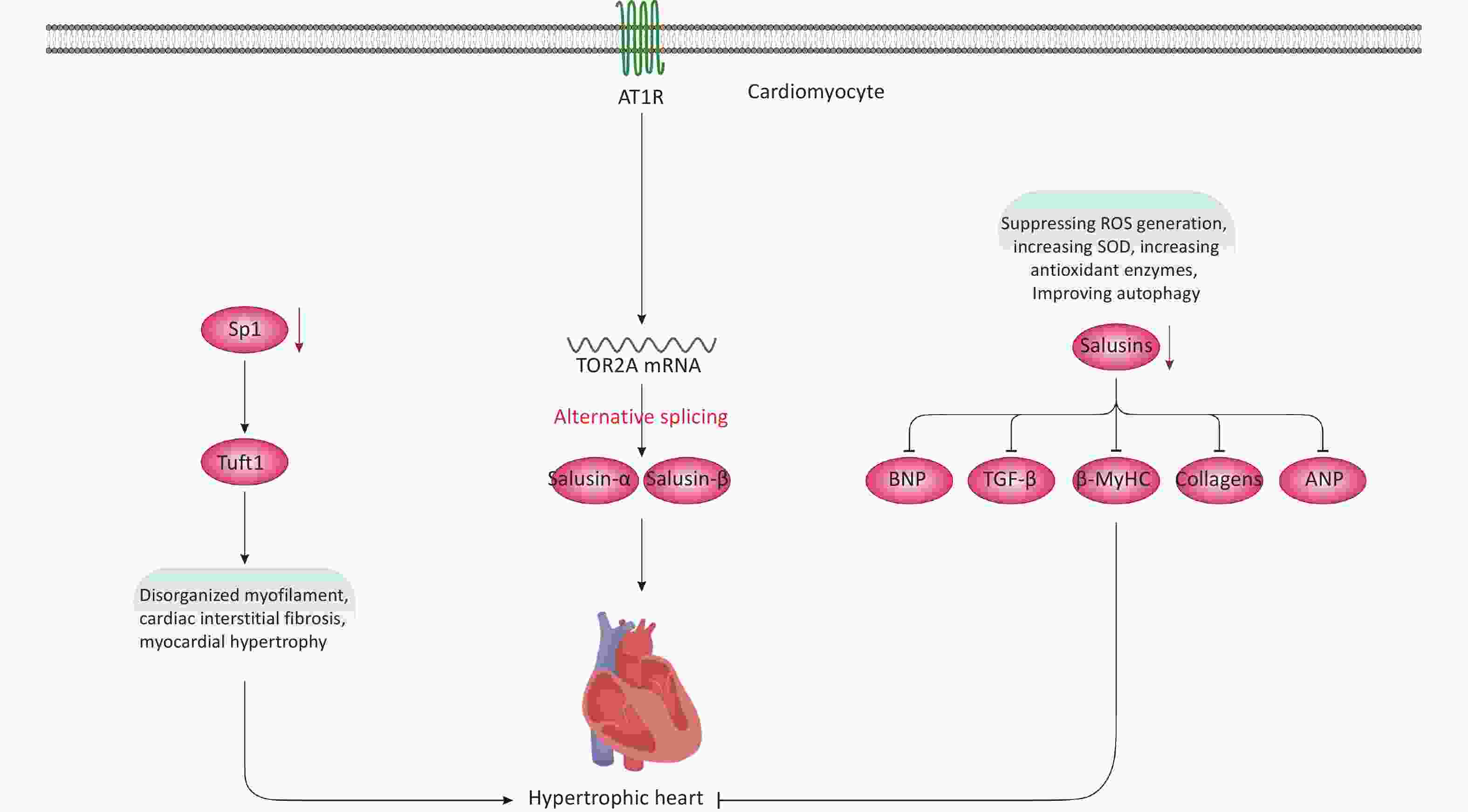 Figure 4. Non-genetic factors and molecules involved in HCM development. Modulation of the Sp1-Tuft1 axis is associated with HCM development mainly due to increased interstitial fibrosis and disorganized myofilament. Besides, Ang II-induced activation of AT1R signaling can lead to the upregulation of salusins, which is closely linked with HCM development via largely unknown mechanisms. Moreover, downregulation of salusins is associated with suppression of multiple factors, resulting in prevention/alleviation of HCM. AT1R, angiotensin II type I receptor;