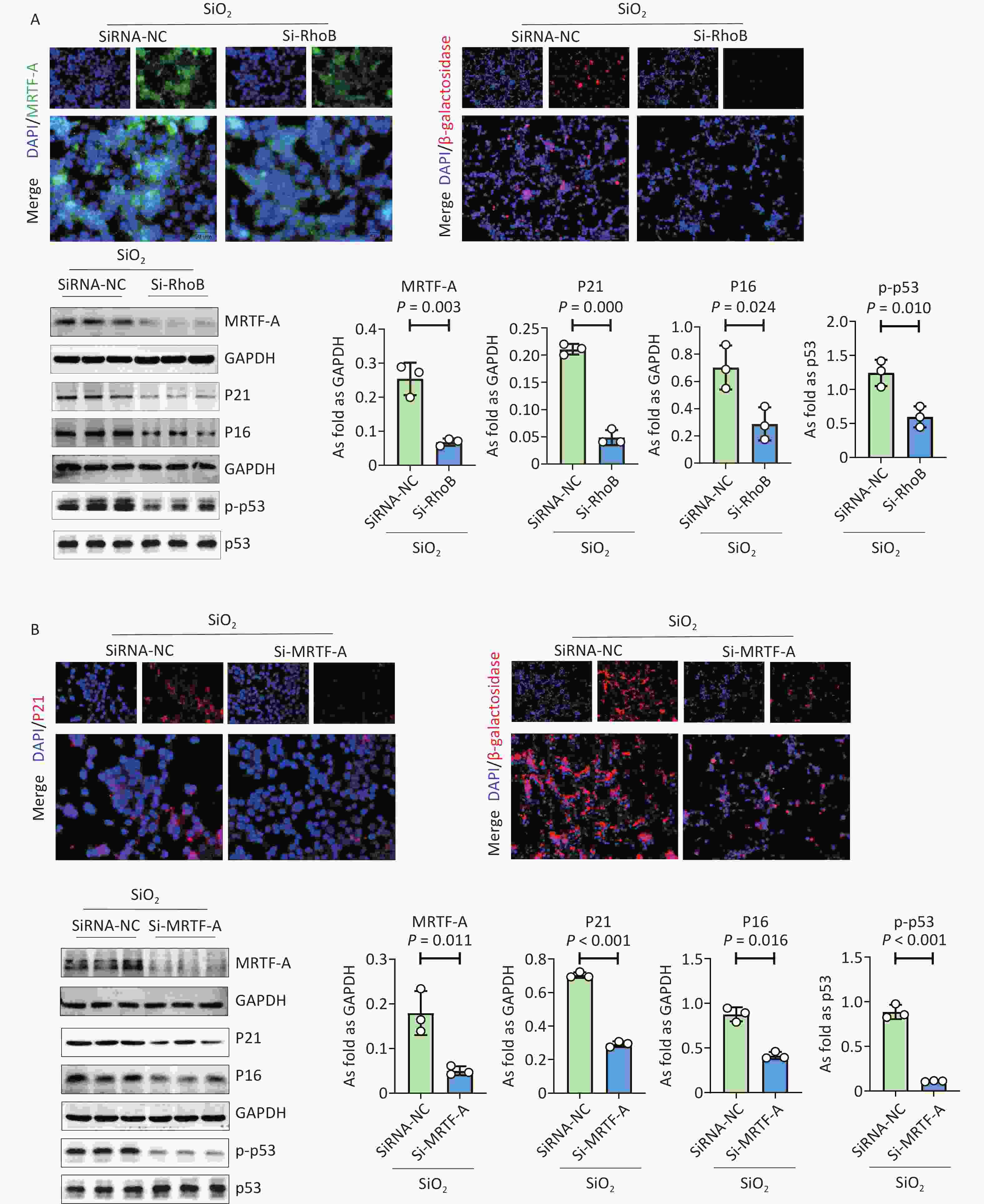 Figure 2. The effect of silencing RhoB or silencing MRTF-A in inhibited MLE12 cell senescence induced by SiO2. (A) Immunofluorescence staining for MRTF-A (400 ×) and β-galactosidase (200 ×) and the protein expression of MRTF-A, P21, P16, and p-p53 in SiO2 induced MLE12 cells treated with RhoB gene silencing; (B) Immunofluorescence staining for P21 (400 ×) and β-galactosidase (200 ×) and Western blot for the protein expression of MRTF-A, P21, P16, and p-p53 in SiO2 induced MLE12 cells treated with MRTF-A gene Silencing.