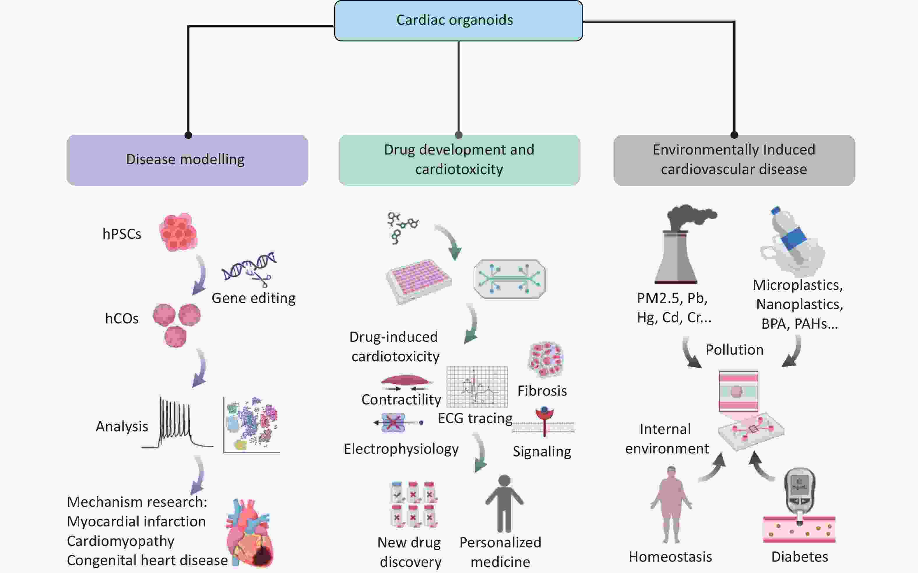Environmental pollution is an important but often overlooked risk factor for cardiovascular diseases such as heart failure. COs offer a substantial advantage owing to their ability to precisely mimic complex pathological microenvironments, including gestational diabetes, pathogenic infections, ionizing radiation, and exposure to drugs and other environmental toxins. They enable dynamic dissection of the regulatory mechanisms of environment-genetic interactions in cardiac development and homeostasis, emerging as a powerful tool for assessing the cardiac toxicity of environmental pollutants.