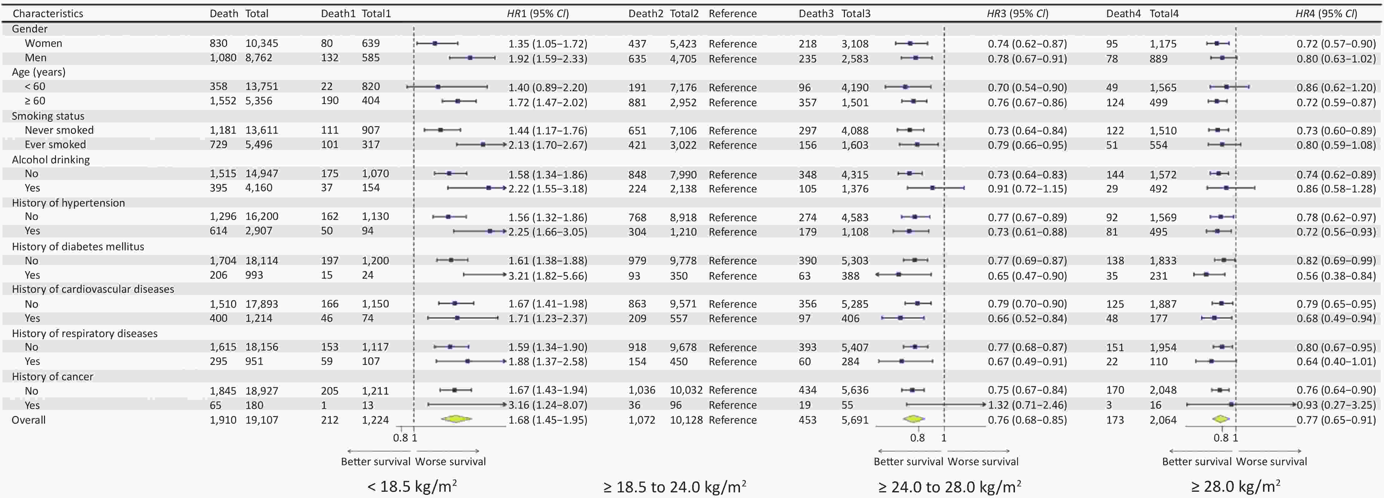 (≥ 28.0 kg/m2)Total 19,107 (100) 1,224 (6.41) 10,128 (53.01) 5,691 (29.78) 2,064 (10.80) Sex 0.016 Women 10,345 (54.14) 639 (52.21) 5,423 (53.54) 3,108 (54.61) 1,175 (56.93) Men 8,762 (45.86) 585 (47.79) 4,705 (46.46) 2,583 (45.39) 889 (43.07) Age (years) < 0.001 < 40 5,233 (27.39) 580 (47.39) 3,045 (30.07) 1,115 (19.59) 493 (23.89) 40–49 4,760 (24.91) 121 (9.89) 2,282 (22.53) 1,727 (30.35) 630 (30.52) 50–59 3,758 (19.67) 119 (9.72) 1,849 (18.26) 1,348 (23.69) 442 (21.41) ≥ 60 5,356 (28.03) 404 (33.01) 2,952 (29.15) 1,501 (26.37) 499 (24.18) Education level < 0.001 Primary school or lower 9,385 (49.12) 532 (43.46) 4,831 (47.70) 2,904 (51.03) 1,118 (54.17) Middle school 6,681 (34.97) 383 (31.29) 3,541 (34.96) 2,060 (36.20) 697 (33.77) High school 2,377 (12.44) 245 (20.02) 1,362 (13.45) 583 (10.24) 187 (9.06) College or higher 664 (3.48) 64 (5.23) 394 (3.89) 144 (2.53) 62 (3.00) Marital status < 0.001 Unmarried 1,921 (10.05) 416 (33.99) 1,201 (11.86) 215 (3.78) 89 (4.31) Married 15,944 (83.45) 719 (58.74) 8,228 (81.24) 5,128 (90.11) 1,869 (90.55) Divorced 88 (0.46) 4 (0.33) 53 (0.52) 28 (0.49) 3 (0.15) Widowed 1,154 (6.04) 85 (6.94) 646 (6.38) 320 (5.62) 103 (4.99) Household per capita income (RMB) < 0.001 < 6,000 11,582 (60.62) 934 (76.31) 6,155 (60.77) 3,217 (56.53) 1,276 (61.82) ≥ 6,000 7,525 (39.38) 290 (23.69) 3,973 (39.23) 2,474 (43.47) 788 (38.18) Smoking status 0.002 Never smoker 13,611 (71.24) 907 (74.10) 7,106 (70.16) 4,088 (71.83) 1,510 (73.16) Ever smoker or current smoker 5,496 (28.76) 317 (25.90) 3,022 (29.84) 1,603 (28.17) 554 (26.84) Alcohol drinking < 0.001 No 14,947 (78.23) 1,070 (87.42) 7,990 (78.89) 4,315 (75.82) 1,572 (76.16) Yes 4,160 (21.77) 154 (12.58) 2,138 (21.11) 1,376 (24.18) 492 (23.84) History of hypertensionb < 0.001 No 16,202 (84.80) 1,130 (92.32) 8,918 (88.05) 4,584 (80.55) 1,570 (76.07) Yes 2,905 (15.20) 94 (7.68) 1,210 (11.95) 1,107 (19.45) 494 (23.93) History of diabetes mellitusc < 0.001 No 18,114 (94.80) 1,200 (98.04) 9,778 (96.54) 5,303 (93.18) 1,833 (88.81) Yes 993 (5.20) 24 (1.96) 350 (3.46) 388 (6.82) 231 (11.19) History of cardiovascular diseasesd < 0.001 No 17,883 (93.59) 1,152 (94.12) 9,568 (94.47) 5,279 (92.76) 1,884 (91.28) Yes 1,224 (6.41) 72 (5.88) 560 (5.53) 412 (7.24) 180 (8.72) History of respiratory diseasese < 0.001 No 17,849 (93.42) 1,085 (88.64) 9,495 (93.75) 5,329 (93.64) 1,940 (93.99) Yes 1,258 (6.58) 139 (11.36) 633 (6.25) 362 (6.36) 124 (6.01) History of cancerf 0.750 No 18,924 (99.04) 1,210 (98.86) 10,031 (99.04) 5,635 (99.02) 2,048 (99.22) Yes 183 (0.96) 14 (1.14) 97 (0.96) 56 (0.98) 16 (0.78) Study sites < 0.001 Longxi Site 5,265 (27.56) 260 (21.24) 2,914 (28.77) 1,653 (29.05) 438 (21.22) Danyang Site 4,456 (23.32) 166 (13.56) 1,991 (19.66) 1,438 (25.27) 861 (41.72) Zhongmu Site 4,933 (25.82) 381 (31.13) 2,710 (26.76) 1,383 (24.30) 459 (22.24) Xiangtan Site 4,453 (23.31) 417 (34.07) 2,513 (24.81) 1,217 (21.38) 306 (14.83) Frequence of fruit intake (per week) 0.06 < 1 day 38 (0.20) 7 (0.57) 15 (0.15) 11 (0.19) 5 (0.24) 1–3 days 207 (1.08) 13 (1.06) 112 (1.11) 65 (1.14) 17 (0.82) 4–6 days 637 (3.33) 44 (3.59) 360 (3.55) 176 (3.09) 57 (2.76) 7 days 18,225 (95.38) 1,160 (94.77) 9,641 (95.19) 5,439 (95.57) 1,985 (96.17) Frequence of meat intake (per week) 0.002 < 1 day 2,437 (12.75) 156 (12.75) 1,303 (12.87) 696 (12.23) 282 (13.66) 1–3 days 7,110 (37.21) 442 (36.11) 3,811 (37.63) 2,059 (36.18) 798 (38.66) 4–6 days 4,455 (23.32) 303 (24.75) 2,381 (23.51) 1,366 (24.00) 405 (19.62) 7 days 5,105 (26.72) 323 (26.39) 2,633 (26.00) 1,570 (27.59) 579 (28.05) Frequence of bean intake (per week) < 0.001 < 1 day 7,627 (39.92) 469 (38.32) 3,927 (38.77) 2,280 (40.06) 951 (46.08) 1–3 days 8,014 (41.94) 514 (41.99) 4,360 (43.05) 2,375 (41.73) 765 (37.06) 4–6 days 2,368 (12.39) 166 (13.56) 1,280 (12.64) 681 (11.97) 241 (11.68) 7 days 1,098 (5.75) 75 (6.13) 561 (5.54) 355 (6.24) 107 (5.18) Intensity of job < 0.001 Mild 7,224 (37.81) 689 (56.29) 3,956 (39.06) 1,882 (33.07) 697 (33.77) Moderate 10,217 (53.47) 464 (37.91) 5,225 (51.59) 3,302 (58.02) 1,226 (59.40) Severe 95 (0.50) 3 (0.25) 48 (0.47) 32 (0.56) 12 (0.58) Extreme severe 1,571 (8.22) 68 (5.56) 899 (8.88) 475 (8.35) 129 (6.25) Note. Data are presented as n (%), unless otherwise specified. The sum of the percentages may not always be 100%, because of rounding. aBMI was classified into four categories according to Chinese standard: Underweight (< 18.5 kg/m2), Desirable weight (≥ 18.5 to < 24.0 kg/m2) (reference), Overweight (≥ 24.0 to < 28.0 kg/m2), Obesity (≥ 28.0 kg/m2). bSelf-reported history of hypertension or hypertension records from the chronic disease system or the cause of death system of the local Center for Disease Control and Prevention. cSelf-reported history of diabetes mellitus or fasting blood glucose ≥ 7 mmol/L at baseline, diabetes mellitus records from the Chronic Diseases Management System, or the Cause of Mortality Registration System of the local Center for Disease Control and Prevention. dSelf-reported history of cardiovascular diseases or cardiovascular diseases records from the Chronic Diseases Management System or Cause of Mortality Registration System of the local Center for Disease Control and Prevention, including myocardial infarction, coronary syndrome, atherosclerosis, stenosis, coronary heart disease, and cerebral infarction. eSelf-reported history of respiratory diseases or respiratory disease records from the Chronic Diseases Management System or the Cause of Mortality Registration System of the local Center for Disease Control and Prevention, including chronic obstructive pulmonary disease, pneumonia, chronic bronchitis, asthma, and pulmonary emphysema. fSelf-reported history of cancer or cancer records from the Chronic Diseases Management System or the Cause of Mortality Registration System of the local Center for Disease Control and Prevention. BMI, body mass index. Table 1. Characteristics of study population at baseline surv