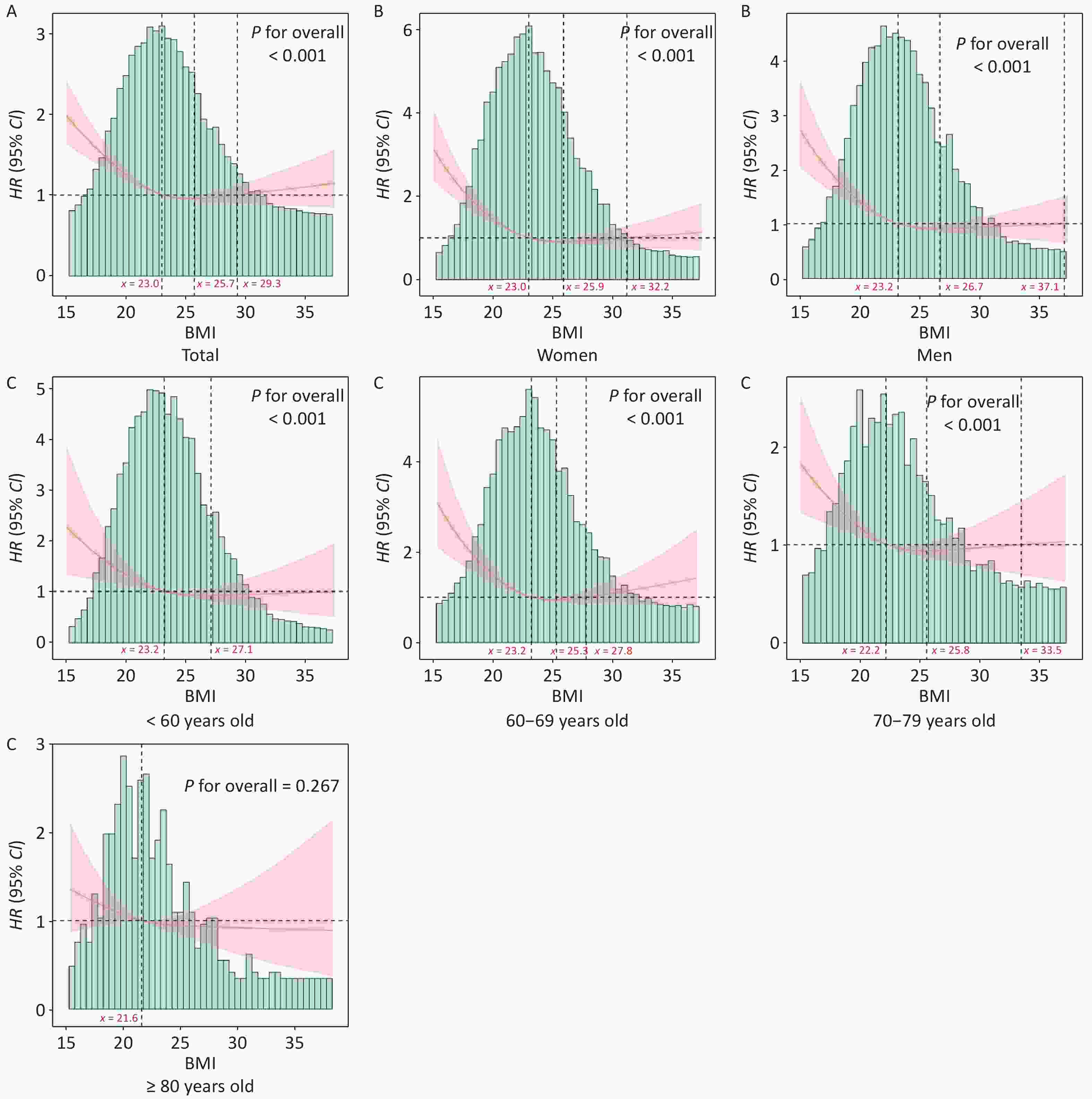 Similar results were observed in the continuous analysis using restricted cubic splines, revealing a U-shaped association between BMI and the risk of all-cause death (Figure 3). Among the overall population, the risk of all-cause death was minimal at 23.0–29.3 kg/m2 (aHR < 1), with a significant increase observed both below and above this range (aHR > 1). The nadir for the risk of death was estimated to be 25.7 kg/m2 (aHR = 0.95, 95% CI: 0.92–0.98). Subgroup analyses stratified by sex and age did not alter the U-shaped association, except for those aged ≥ 80 years. A reverse J-shaped association between BMI and the risk of death was found, with a nadir of 21.6 kg/m2 for individuals aged ≥ 80 years, but the association did not reach statistical significance (P = 0.267).