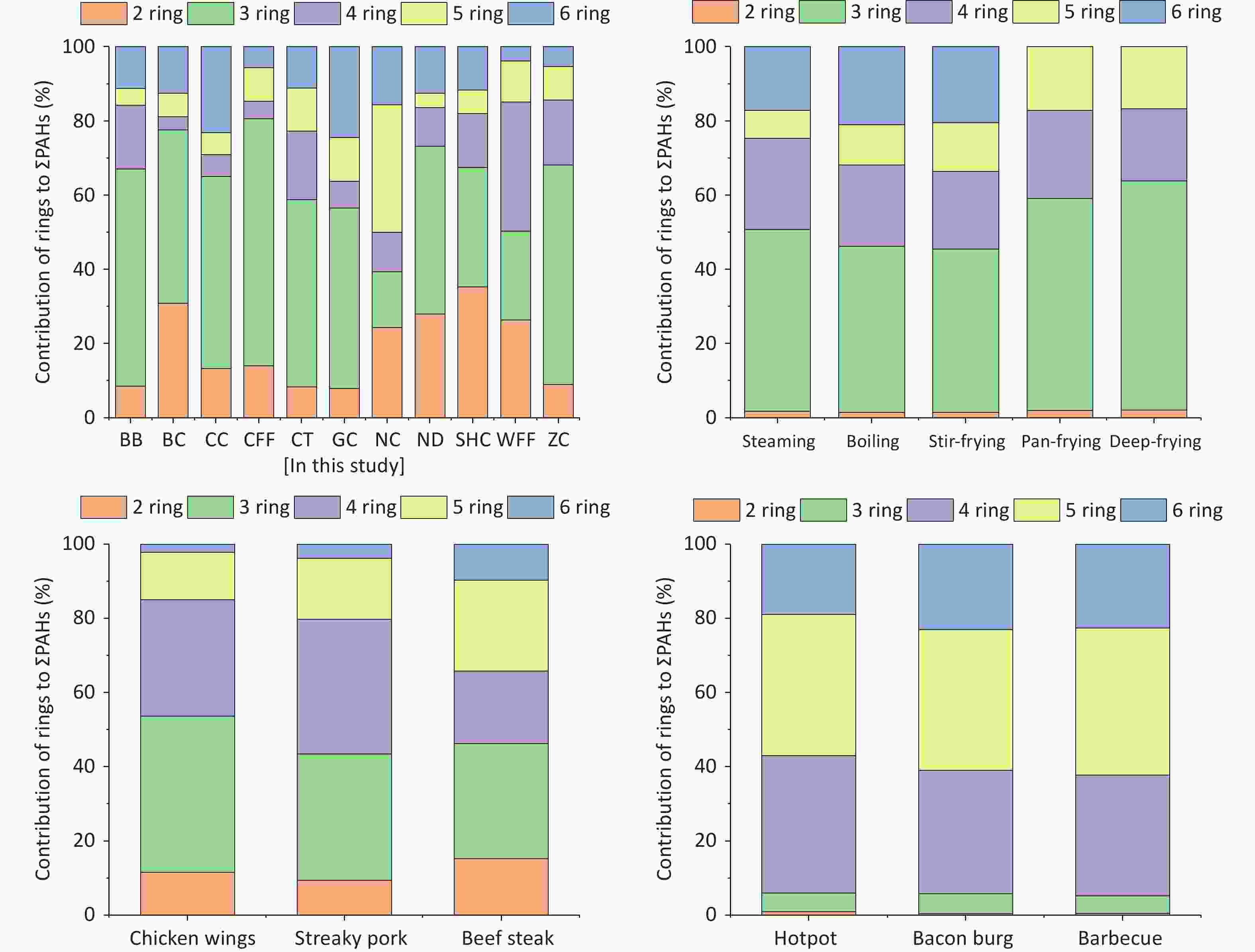 For all cooking methods, 2- and 3-ring PAHs constituted 39.4%–80.6% of ΣPAHs (Figure 2). Additionally, the contribution of 4-ring PAHs to ΣPAHs in the WFF sample reached 34.8%, and that of 5-ring PAHs in the NC sample was 34.4%, which was significantly higher than those of the other cooking types. In this study, low-molecular-weight PAHs were the main contributors to ΣPAHs for the majority of the cooking styles investigated. In another study, 3- and 4-ring PAHs were the main contributors to ΣPAHs during meat cooking [69], which was consistent with the results of some of the cooking styles in this study.