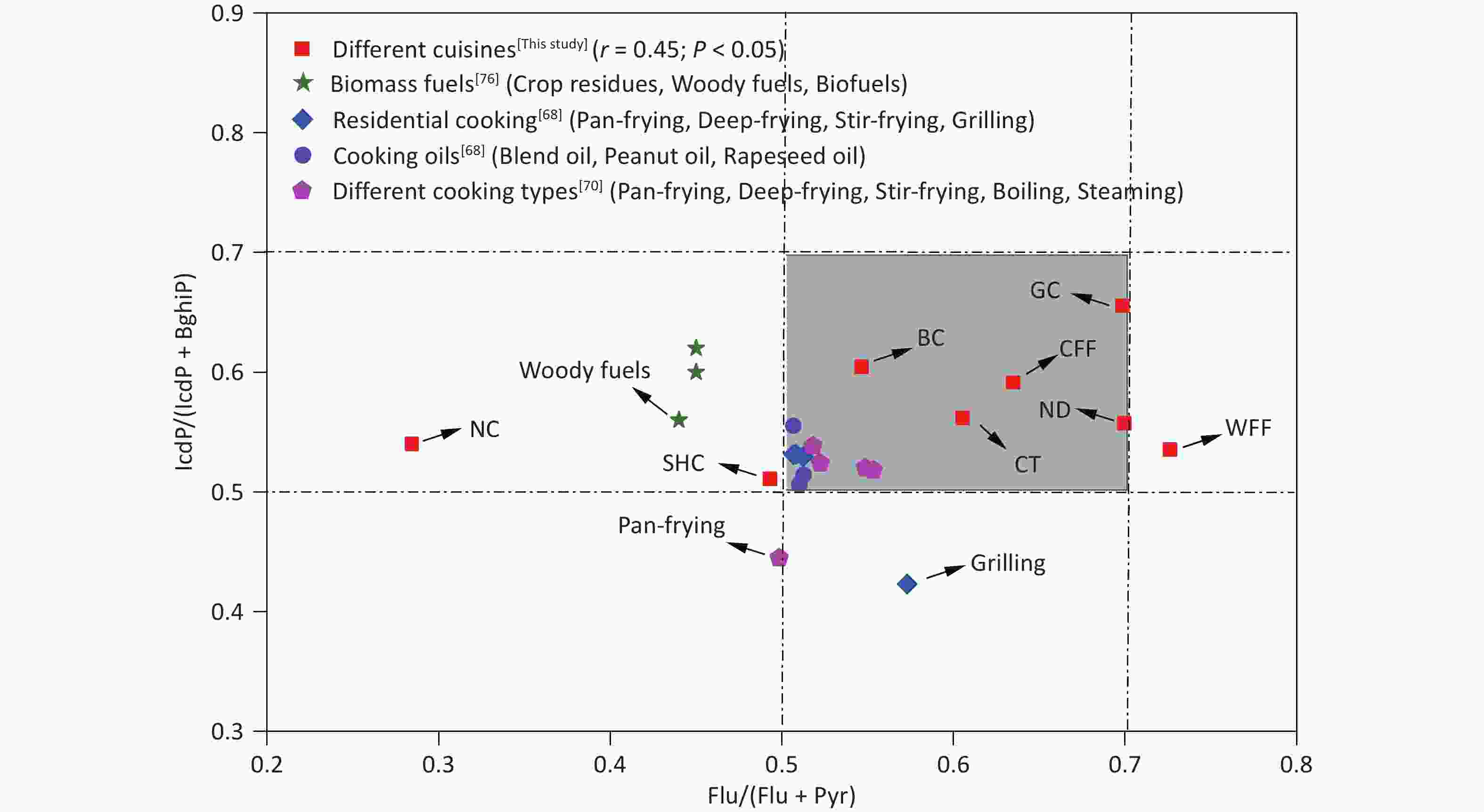 Specific diagnostic ratios of PAH isomers, including Flu/(Flu+Pyr), Ant/(Ant+Phe), and IcdP/(IcdP+BghiP), have been commonly used as indicators to identify potential sources of PAHs in the environment[70-72]. Notably, however, not all such diagnostic ratios are universally applicable. For instance, the Ant/(Phe+Ant) ratio is susceptible to photocatalytic effects and is more suitable for analyzing gaseous-phase PAHs, whereas Flu/(Flu+Pyr) and Icdp/(Icdp+BghiP) are typically used to assess particulate-phase PAHs[73]. Ratios such as Flu/(Flu+Pyr) and IcdP/(Icdp+BghiP) have been used to identify potential sources of PAHs in fossil fuel combustion, biomass fuel, coal combustion, and industrial processes[74-76]. As shown in Figure 3, the Flu/(Flu+Pyr) and IcdP/(IcdP+BghiP) ratios for the various cooking styles were predominantly in the ranges of 0.29–0.71 and 0.50–0.66, respectively, aligning with the diagnostic ranges observed in residential cooking in a previous study[68]. Some variability in the diagnostic ratios of Flu/(Flu+Pyr) and IcdP/(IcdP+BghiP) existed among the different cooking styles, which was mainly due to the differences in cooking methods, oil temperature, and ingredients. This discovery of the stable nature of these diagnostic ratios in most cooking styles underscores their usefulness as critical benchmarks for identifying PAH sources in various culinary environments.