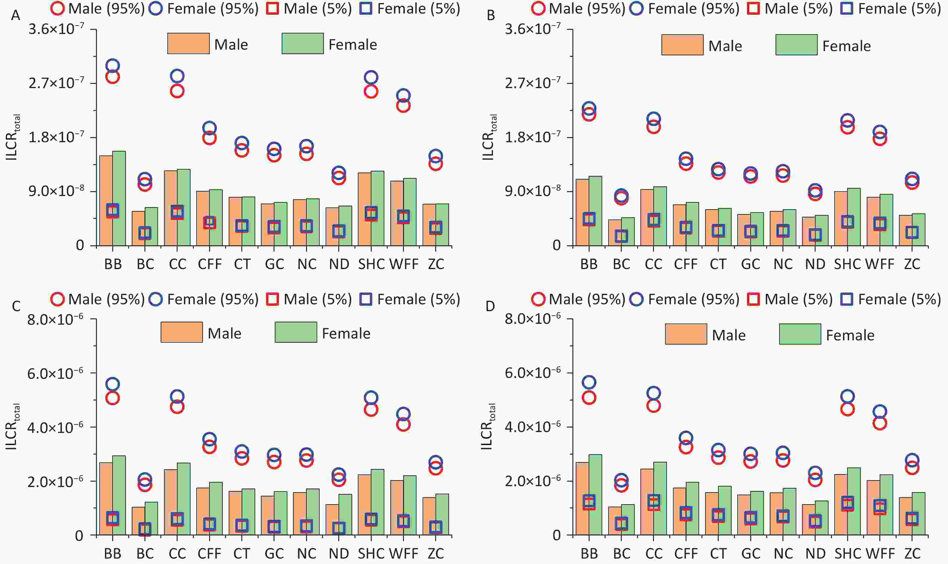 According to USEPA recommendations[78], ILCR < 10–6 indicates that the potential health risk is negligible; 10–6 < ILCR < 10–4 indicates that the potential health risk is within the acceptable range; and ILCR > 10–4 indicates a serious potential health risk. The ILCRs associated with the three exposure routes to PAHs from different cooking styles were assessed in four different groups stratified by age and sex and prioritized as ingestion > dermal contact > inhalation (Supplementary Table S8). For all cooking styles, the average ILCRtotal values ranged from 8.26 × 10−8 to 3.88 × 10−6 for females and from 7.81 × 10−8 to 3.53 × 10−6 for males. The ILCRtotal values for adults (1.23 × 10−6 to 3.70 × 10−6) and older adults (1.28 × 10−6 to 3.88 × 10−6) exceeded the acceptable limit of 1.00 × 10–6, and females showing a higher cancer risk (Figure 4). The ILCRtotal values were higher in the older adult group than in the other age groups. Generally, the ILCRtotal values were lower for children than for older adults, exhibiting a trend of first decreasing and then increasing with increase in age. Notably, the ILCRtotal values were significantly higher for BB, CC, SHC, and WFF than for the other cooking styles, which were mainly influenced by BaA, BaP, DBahA. In addition to the higher TEF values of these PAH monomers, the higher concentrations of some PAH monomers were also influencing factors.