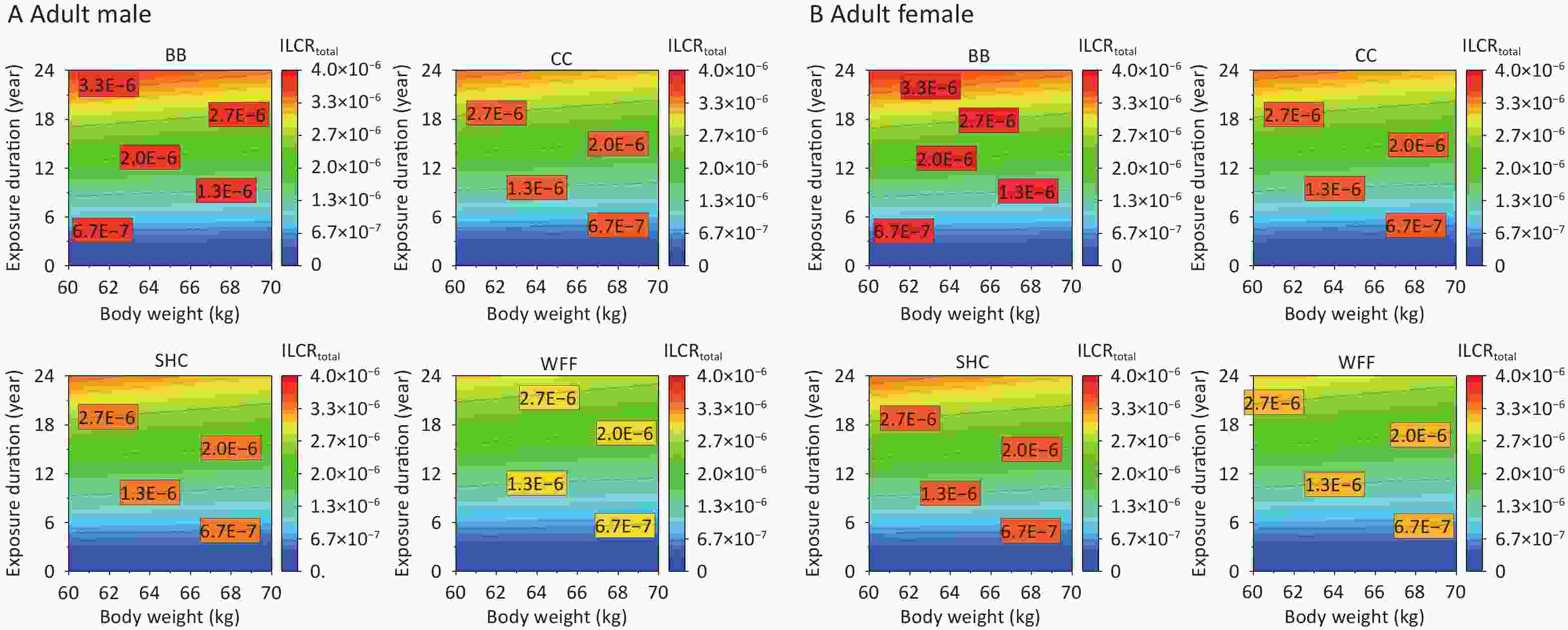 $$ {ILCR}_{ing}^{i,j}=\frac{{C}_{i,j}\times {TEF}_{i}\times \sqrt[1/3]{\dfrac{BW}{70}}\;{\times\; CSF}_{ing}\times {IR}_{ing}\times ED\times EF}{BW\times AT}\times CF $$ (3) $$ {ILCR}_{inh}^{i,j}=\frac{{C}_{i,j}\times {TEF}_{i}\times {\sqrt[1/3]{\dfrac{BW}{70}}\times CSF}_{inh}\times {IR}_{inh}\times ED\times EF}{BW\times AT\times PEF} $$ (4) $$ \begin{aligned} & {ILCR}_{der}^{i,j}=\\ & \dfrac{{C}_{i,j} \times {TEF}_{i}\times \sqrt[1/3]{\dfrac{BW}{70}} \times {CSF}_{der}\times SA\times AF\times ABS\times ED\times EF}{BW\times AT}\times CF \end{aligned} $$ (5) $$ {ILCR}_{total}^{i,j} = {ILCR}_{ing}^{i,j}+{ILCR}_{inh}^{i,j}+{ILCR}_{der}^{i,j} $$ (6) where $ {C}_{i,j} $represents the average concentration of the ith PAH species in the jth cooking style (ng/m3); $ {CSF}_{ing} $, $ {CSF}_{inh} $, and $ {CSF}_{der} $ represent the carcinogenic slope factors of the ingestion, inhalation, and dermal contact routes (7.3, 3.85, and 25 mg·kg−1·d−1, respectively[58]); $ {IR}_{ing} $ (mg/d) and $ {IR}_{inh} $ (m3/d) represent the ingestion and inhalation rates, respectively; $ ED $ represents the exposure duration (years); $ CF $ represents the conversion factor (10–6); $ EF $ represents the exposure frequency (d/year); $ BW $ represents the body weight (kg); $ AT $ represents the average contact time (25,550 d)[59]; $ PEF $ represents the particulate emission factor (1.36 × 109 m3/µg)[60]; $ SA $ represents the dermal surface area (m2/d); $ AF $ represents the dermal adherence factor (mg/cm2); and $ ABS $ represents the dermal adsorption fraction (unitless, 0.13)[61]. The detailed parameters are listed in Supplementary Table S5.