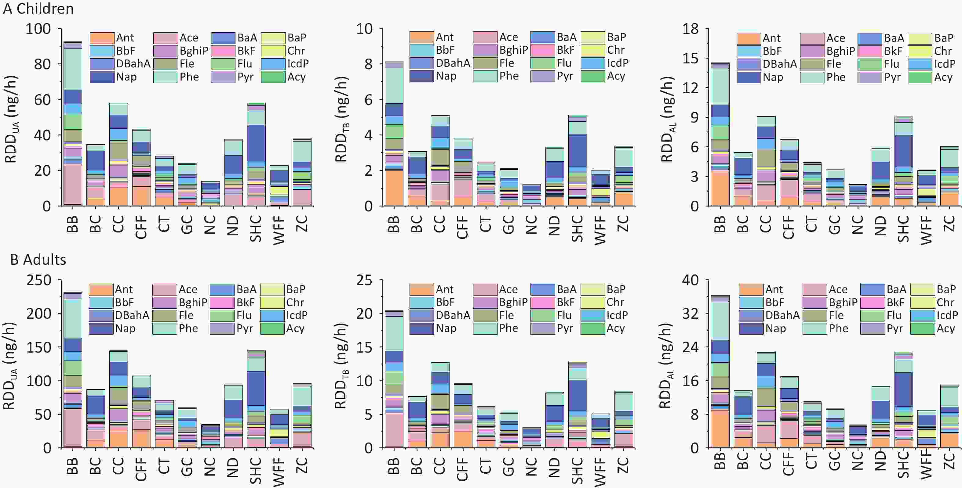Figure 7. RDDUA, RDDTB, and RDDAL of PM2.5-bound PAHs emitted from different cooking styles in (A) children and (B) adults. RDD: respiratory deposition doses; BB: Barbecue; BC: Beijing cuisine; CC: Chinesecuisine; CFF: Chinese fast food; CT: Canteen; GC: Guangdong cuisine; NC: Northeastcuisine; ND: Noodle; SHC: Sichuan and Hunan cuisine; WFF: Western fast food; ZC: Zhejiang cuisine.