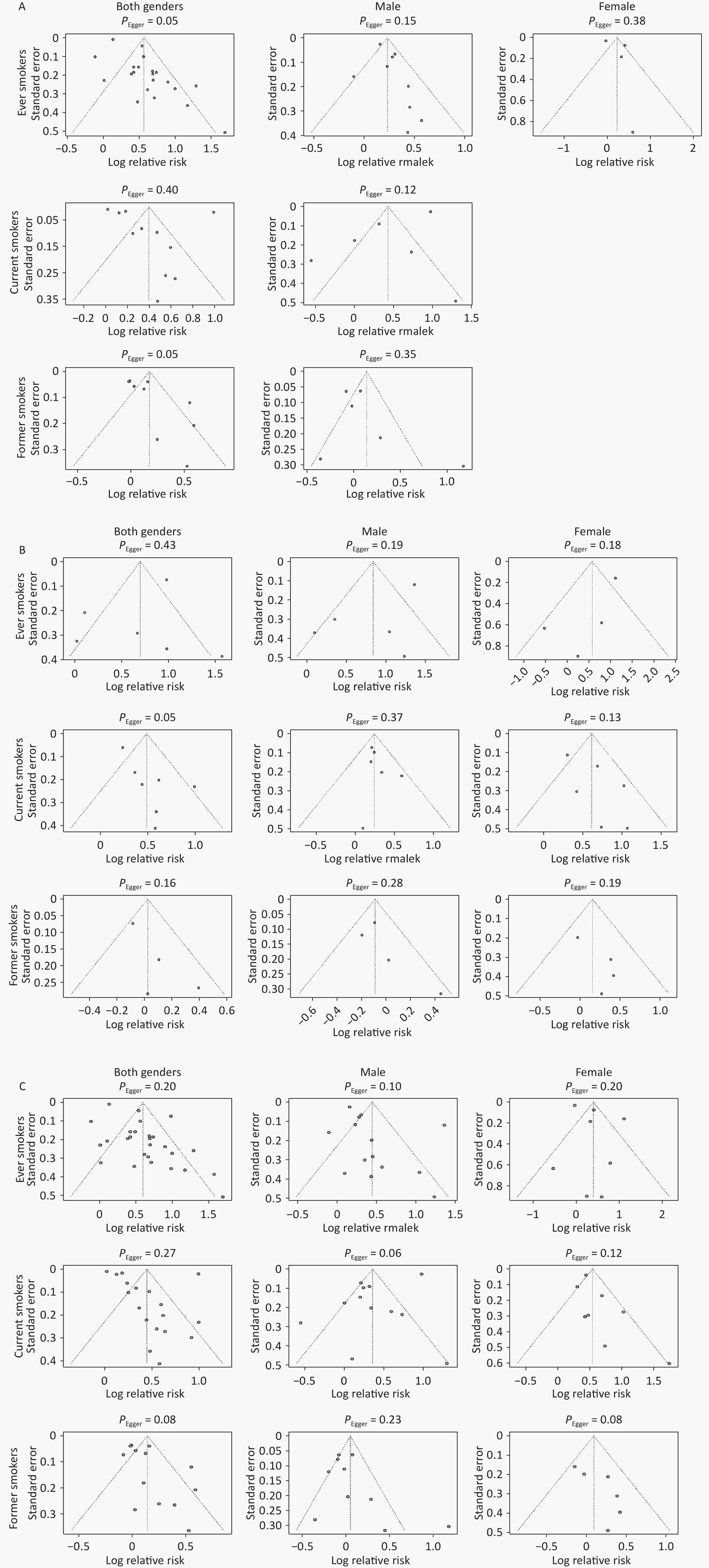 Meta-analyses of the nine groups stratified by smoking status (ever-smokers, current smokers, and former smokers) and sex in China, other Asian countries, and all Asian countries are shown in Table 2. The RRs of the nine groups stratified by smoking status and sex in China and all Asian countries showed no significant differences, but the RRs of males in ever smokers between China and other Asian countries were statistically different.
