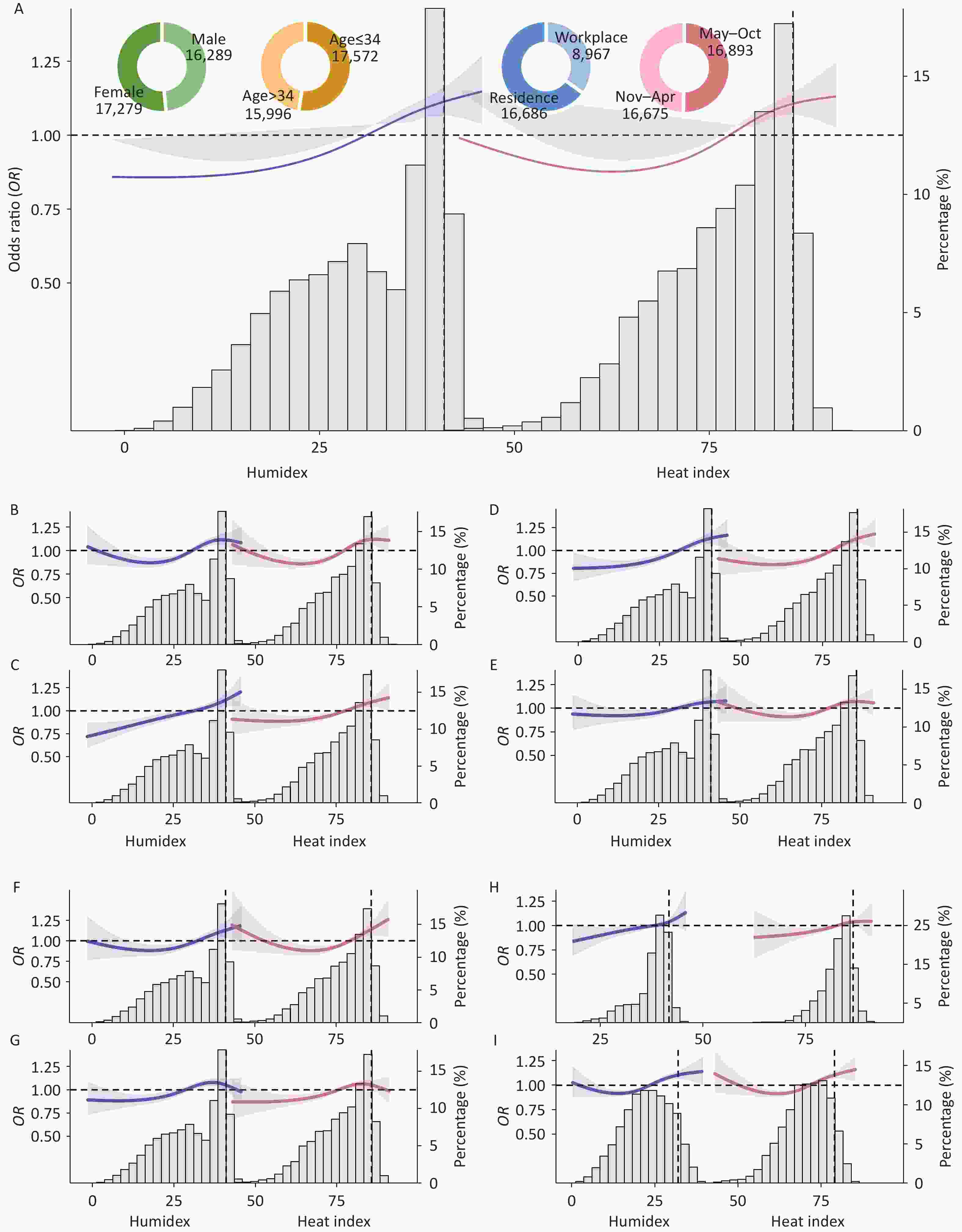 In total, 33,568 case days and 114,038 control days were included in the study period (Supplementary Table S1). The humidex and heat index for the case days were generally higher than those for the control days (Supplementary Table S2).