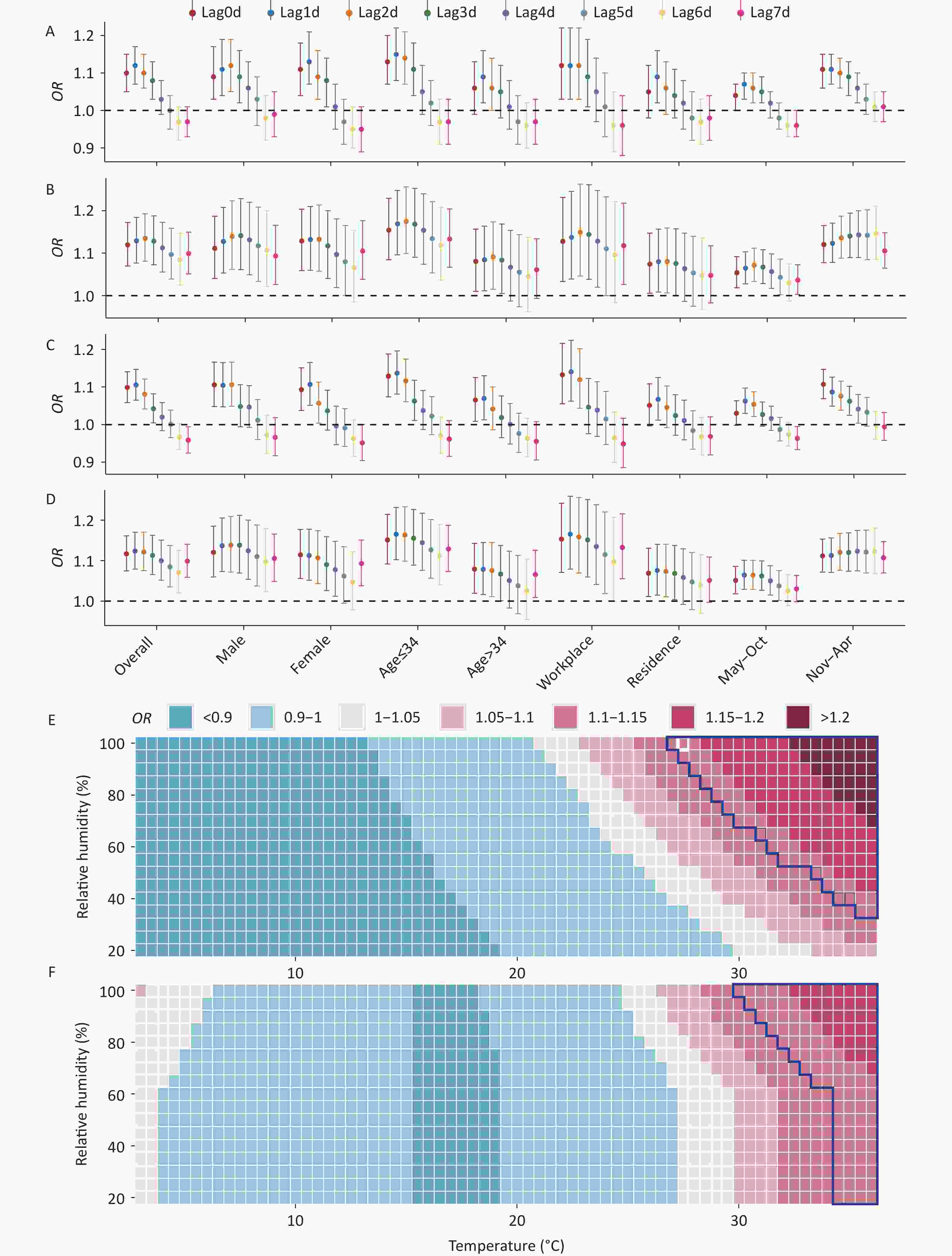 Figure 3. Risk of MDs-related EMS calls associated with compound temperature and humidity extremes and different temperature–humidity combinations. Panels A and B represent single-day and cumulative-day lag effects for humidex, respectively; panels C and D represent single-day and cumulative-day lag effects for the heat index, respectively; panels E and F represent humidex and heat index, respectively. Areas enclosed by dark blue lines represent compound temperature and humidity extremes (≥ 90th percentile). OR, odds ratio.
