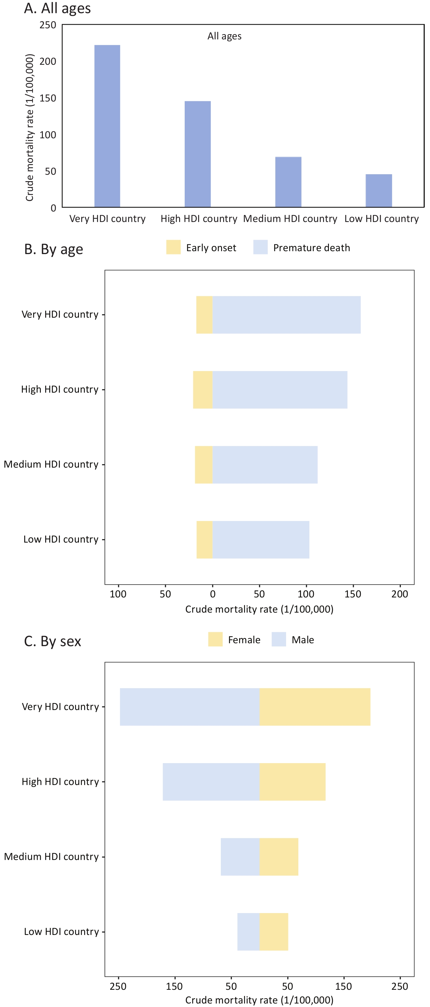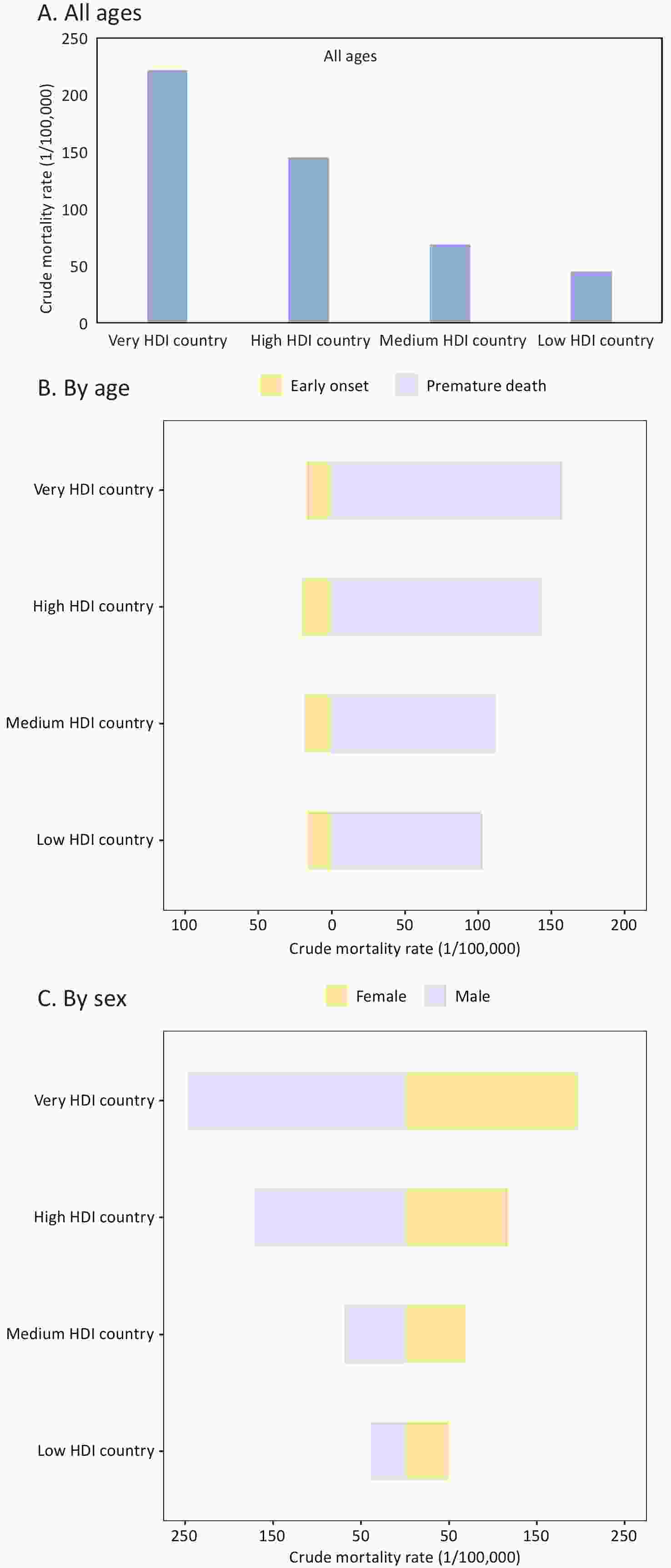 Figure 2. Crude mortality rate (1/100,000) for all cancers in 2022. Definition of abbreviations: HDI, human development index. Early-onset cancer: cancer diagnosed before the age of 50 years. Premature death: death occurring between the ages of 30 and 69 years.