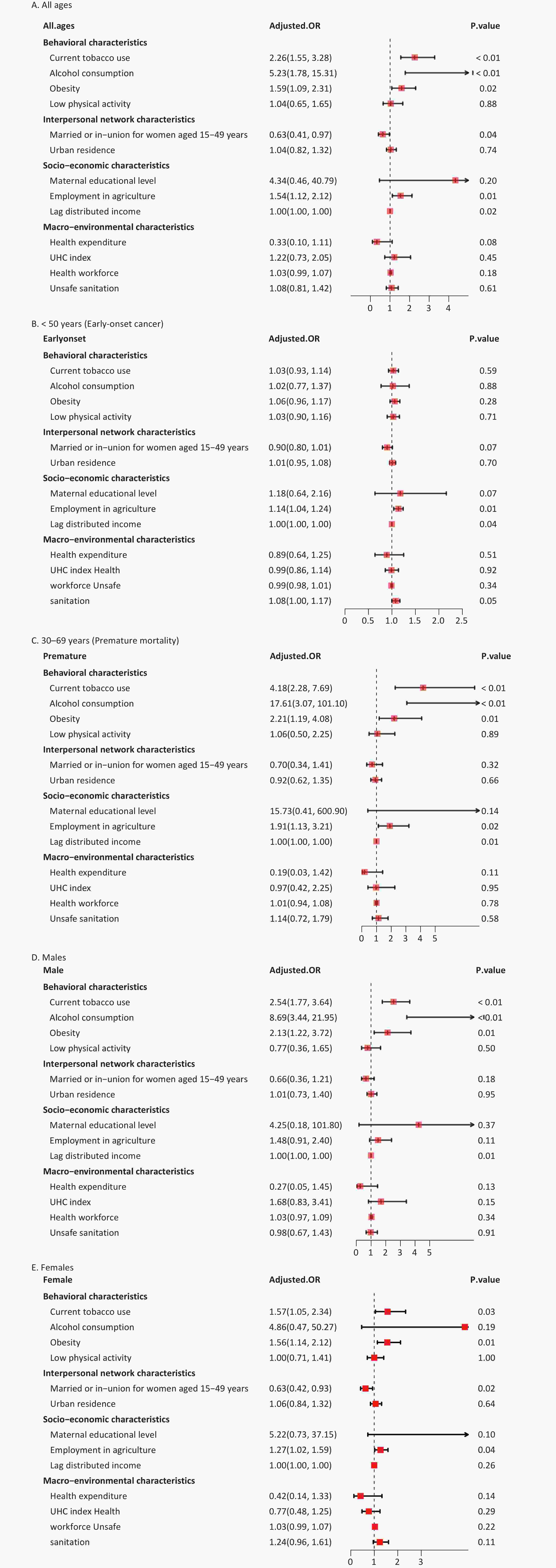 We also noted a pronounced sex disparity in health determinants linked to all-cancer ASMR. Among males, there were notable positive associations between current tobacco use [2.54 [1.77, 3.64)], alcohol consumption [8.69 (3.44, 21.95)], obesity [2.13 (1.22, 3.72)], and all-cancer ASMR. In females, current tobacco use [1.57 (1.05, 2.34)], obesity [1.56 (1.14, 2.12)], and employment in agriculture [1.27 (1.02, 1.59)] were positively associated with all-cancer ASMR. Notably, being married or in a union among women aged 15–49 years [0.63 (0.42, 0.93)] was negatively associated with ASMR (Figure 3D–E).