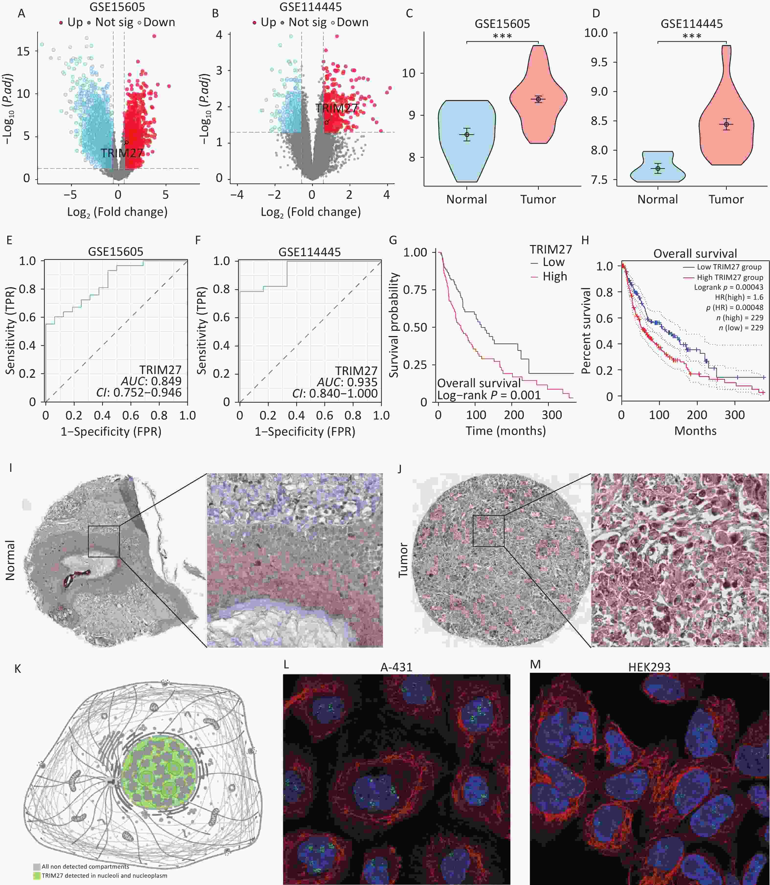 Figure 2. Analyses of the expression and subcellular localization of TRIM27 in SKCM and its diagnostic and prognostic abilities. (A–B) Volcano plots of TRIM27 in the GEO datasets. (C–D) Comparison of the intergroup expression of TRIM27 in the GEO datasets. (E–F) ROC curves of TRIM27 in the GEO datasets. (G) Kaplan-Meier curve of TRIM27 effects in SKCM based on TCGA data. (H) Kaplan-Meier curve of TRIM27 effects in SKCM based on GEPIA2 data. (I–J) Immunohistochemical staining images of TRIM27 in SKCM based on HPA data. (K) Subcellular localization map of TRIM27 based on HPA data. (L–M) Subcellular localization maps of TRIM27 in A-431 and HEK293 cells based on HPA data. *P < 0.05, ***P < 0.001.
